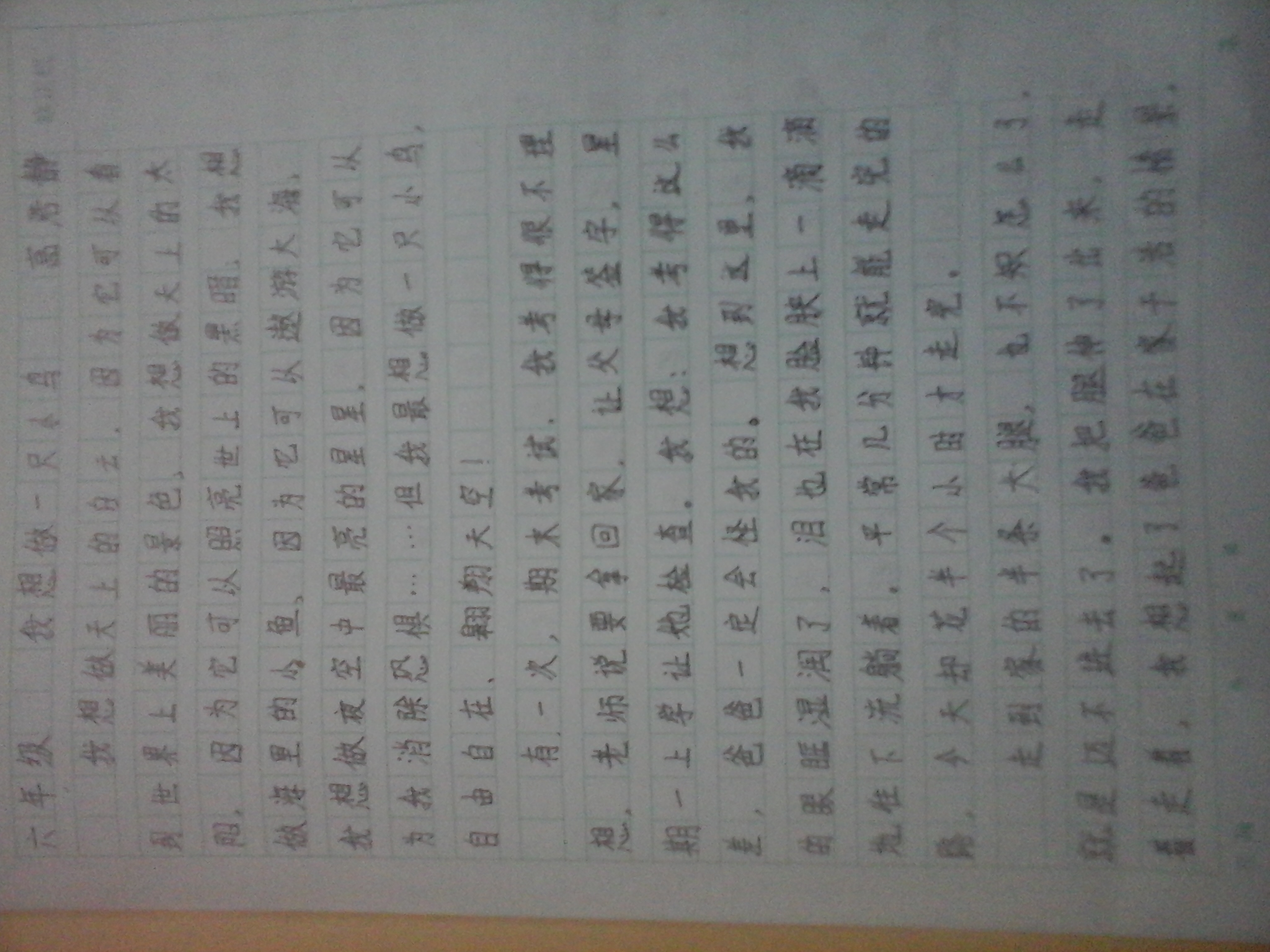 我想做一只小鸟 热361 类别:记叙 发表时间:2018-09-02 22:46 已有 362 次阅读 指导老师:张书有 所属学校:登封市大金店镇中心小学