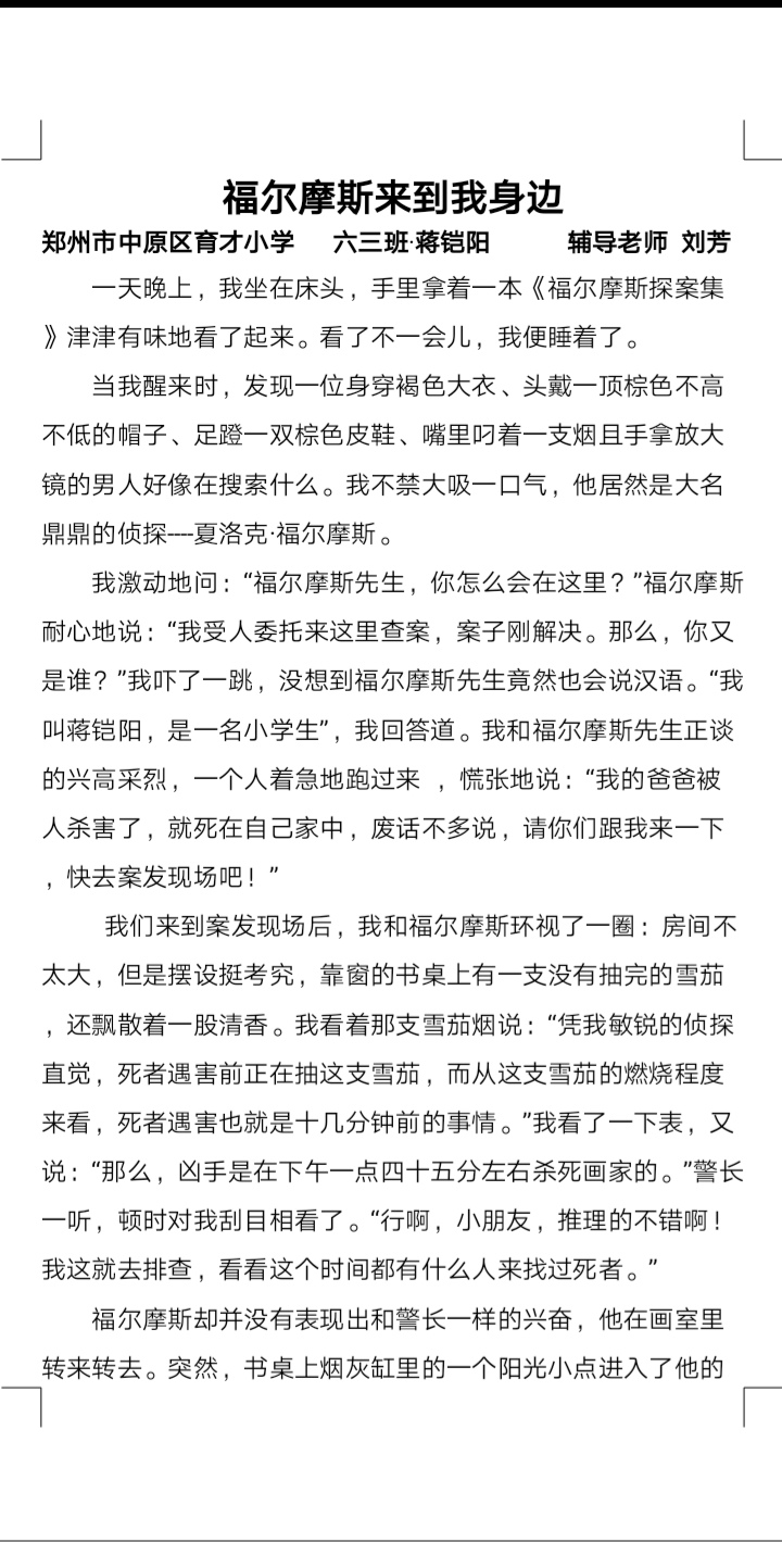 福尔摩斯来到我身边 热705 类别:叙事 发表时间:2018-10-08 22:33 已有 706 次阅读 指导老师:刘芳 所属学校:郑州市中原区育才小学