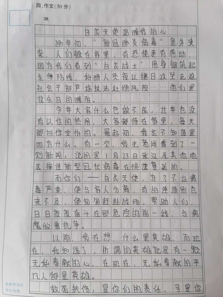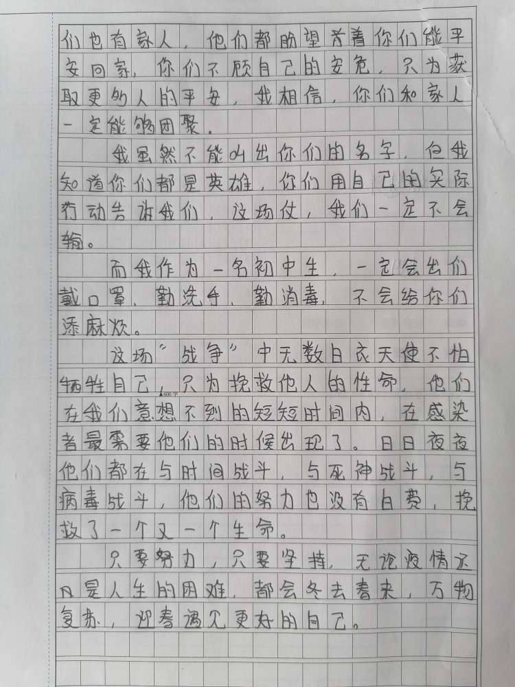 白衣天使温暖我的心 热403 类别:写人 发表时间:2020-05-30 15:50 已有 404 次阅读 指导老师:王湘敏 所属学校:登封市大金店镇第一初级中学