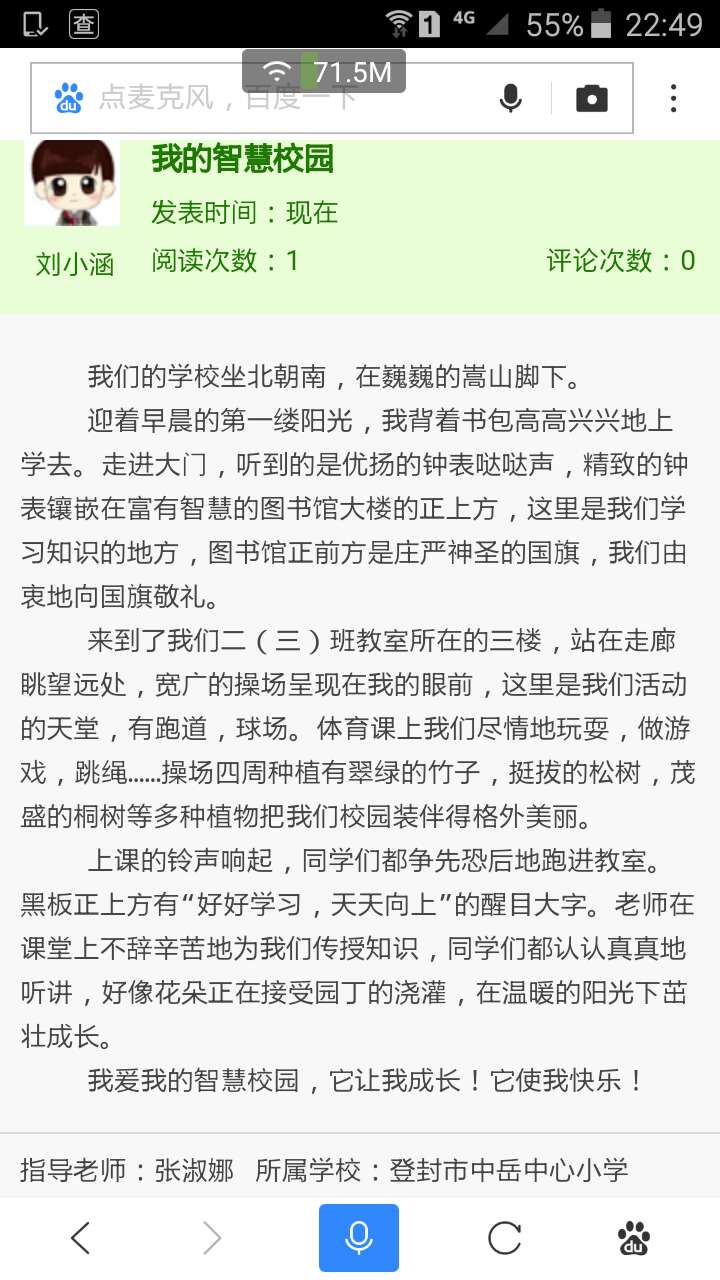 我的智慧校园 热1252 类别:叙事 发表时间:2017-10-14 18:35 已有 1253 次阅读 指导老师:张淑娜 所属学校:登封新区中强学校