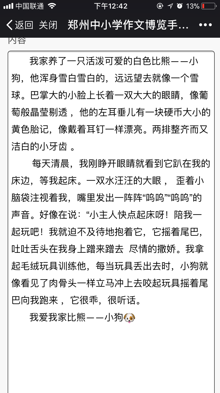我家的比熊——小狗 热877 类别:其他 发表时间:2017-10-15 12:48 已有 879 次阅读 指导老师:李丽芬 所属学校:金水区黄河路第一小学
