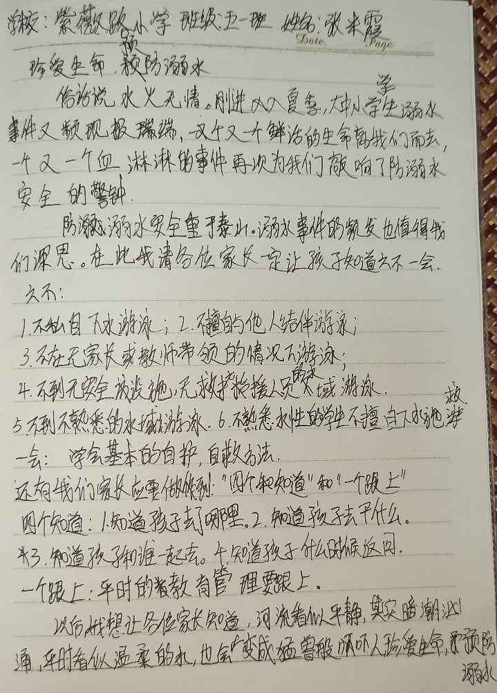 珍爱生命,预防溺水 热621 类别:记叙 发表时间:2021-08-22 20:00 已有 622 次阅读 指导老师:魏淑娟 所属学校:中牟县紫薇路小学