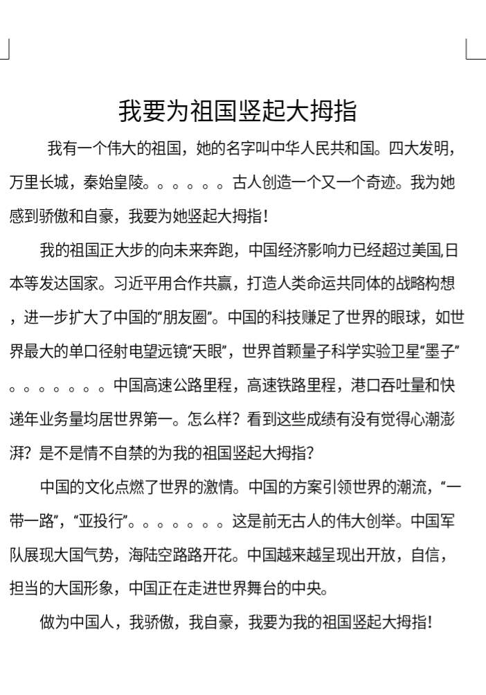 我为祖国竖起大拇指 热402 类别:抒情 发表时间:2019-07-22 12:32 已有 404 次阅读 指导老师:朱百艳 所属学校:金水区柳林镇第四小学