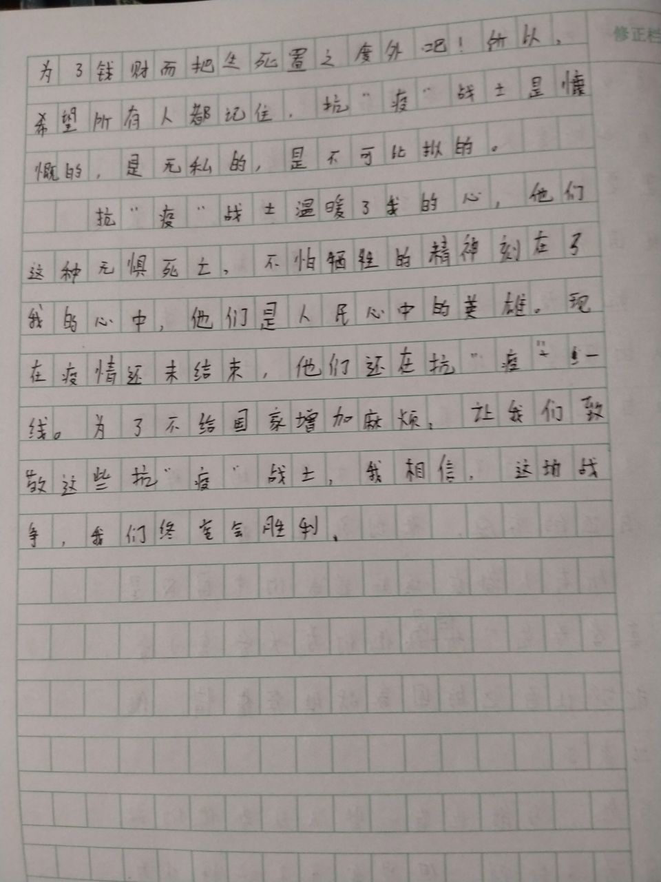 抗“疫”战士温暖我的心 热983 类别:原创 发表时间:2020-05-31 09:14 已有 984 次阅读 指导老师:韩亚会 所属学校:登封新区中强学校