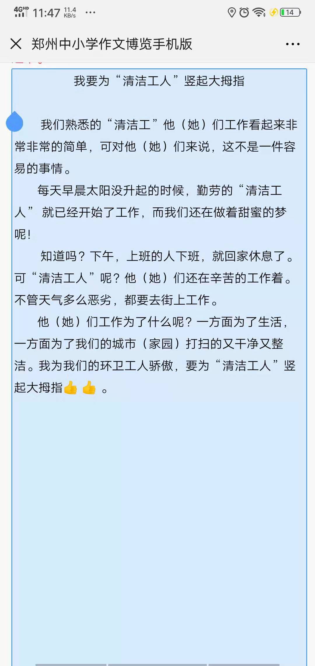 我要为环卫工人竖起大拇指 热542 类别:写人 发表时间:2019-07-21 12:04 已有 544 次阅读 指导老师:张引引 所属学校:薛岗小学