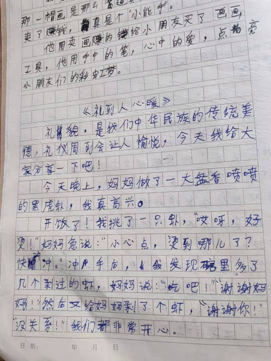 礼到人心暖 热526 类别:记叙 发表时间:2019-07-16 17:06 已有 527 次阅读 指导老师:张引引 所属学校:薛岗小学