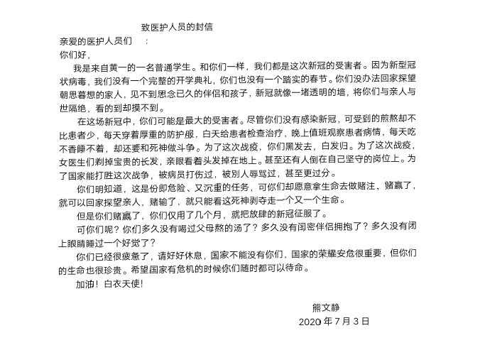 致医护人员的一封信 热322 类别:叙事 发表时间:2020-07-03 22:14 已有 323 次阅读 指导老师:徐晶华 所属学校:金水区黄河路第一小学