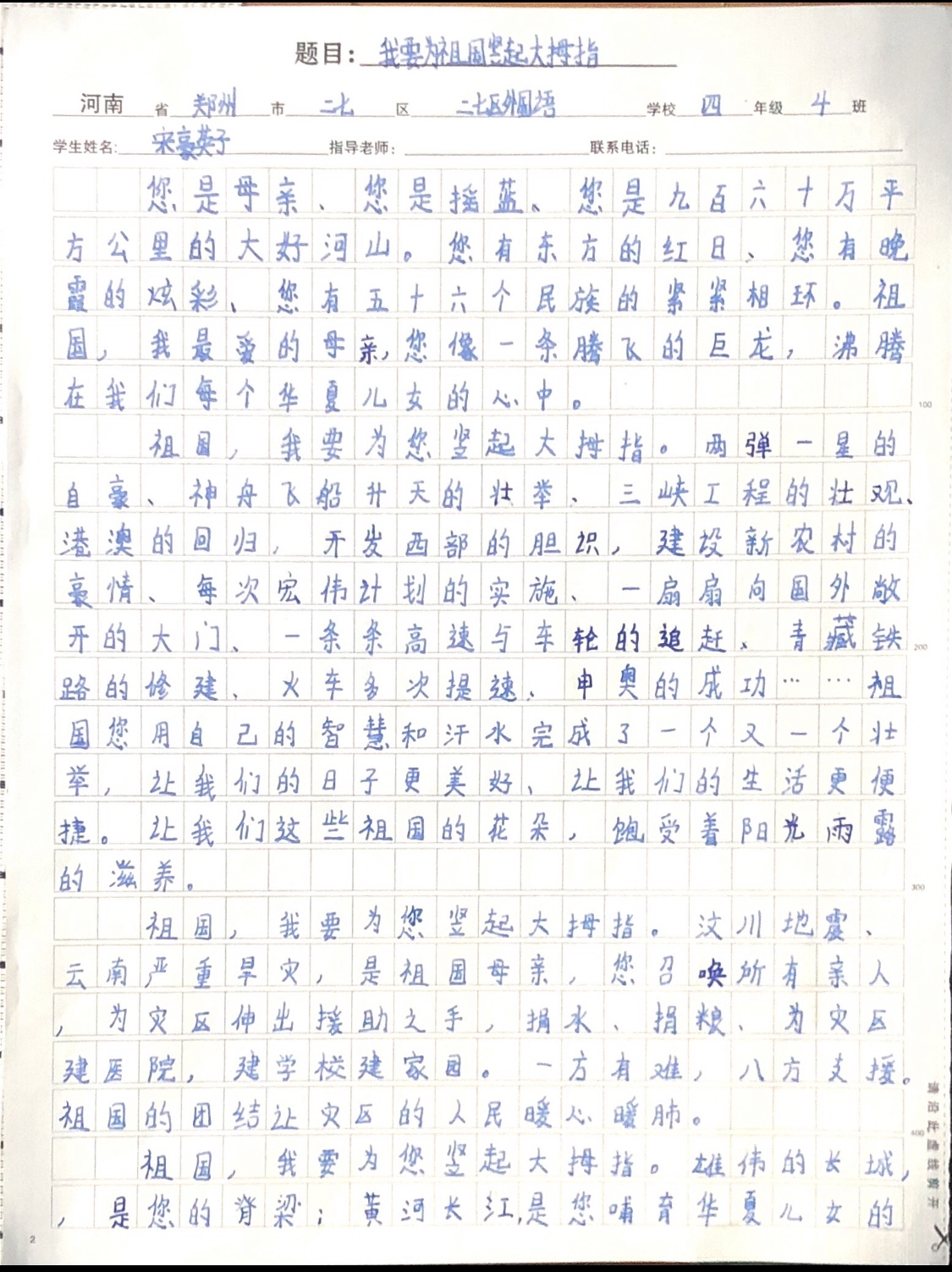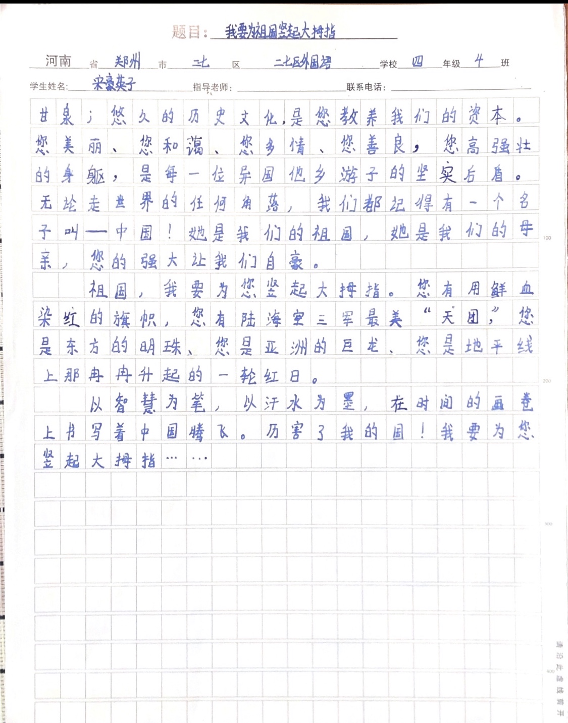 我要为祖国竖起大拇指 热1174 类别:抒情 发表时间:2019-10-06 22:39 已有 1175 次阅读 指导老师:陈静 所属学校:郑州市二七区外国语小学