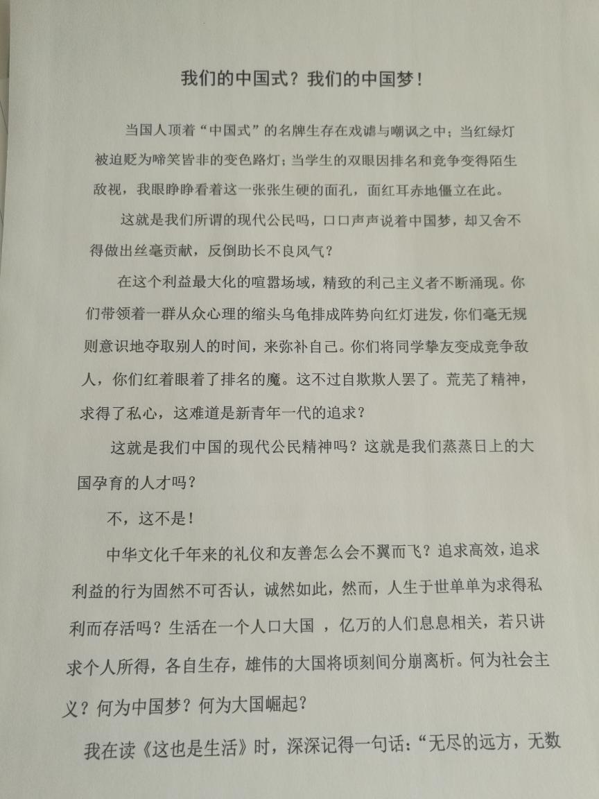 我们的中国式?我们的中国梦! 热520 类别:议论 发表时间:2018-08-24 13:16 已有 521 次阅读 指导老师:杨普光 所属学校:郑州外国语学校分校