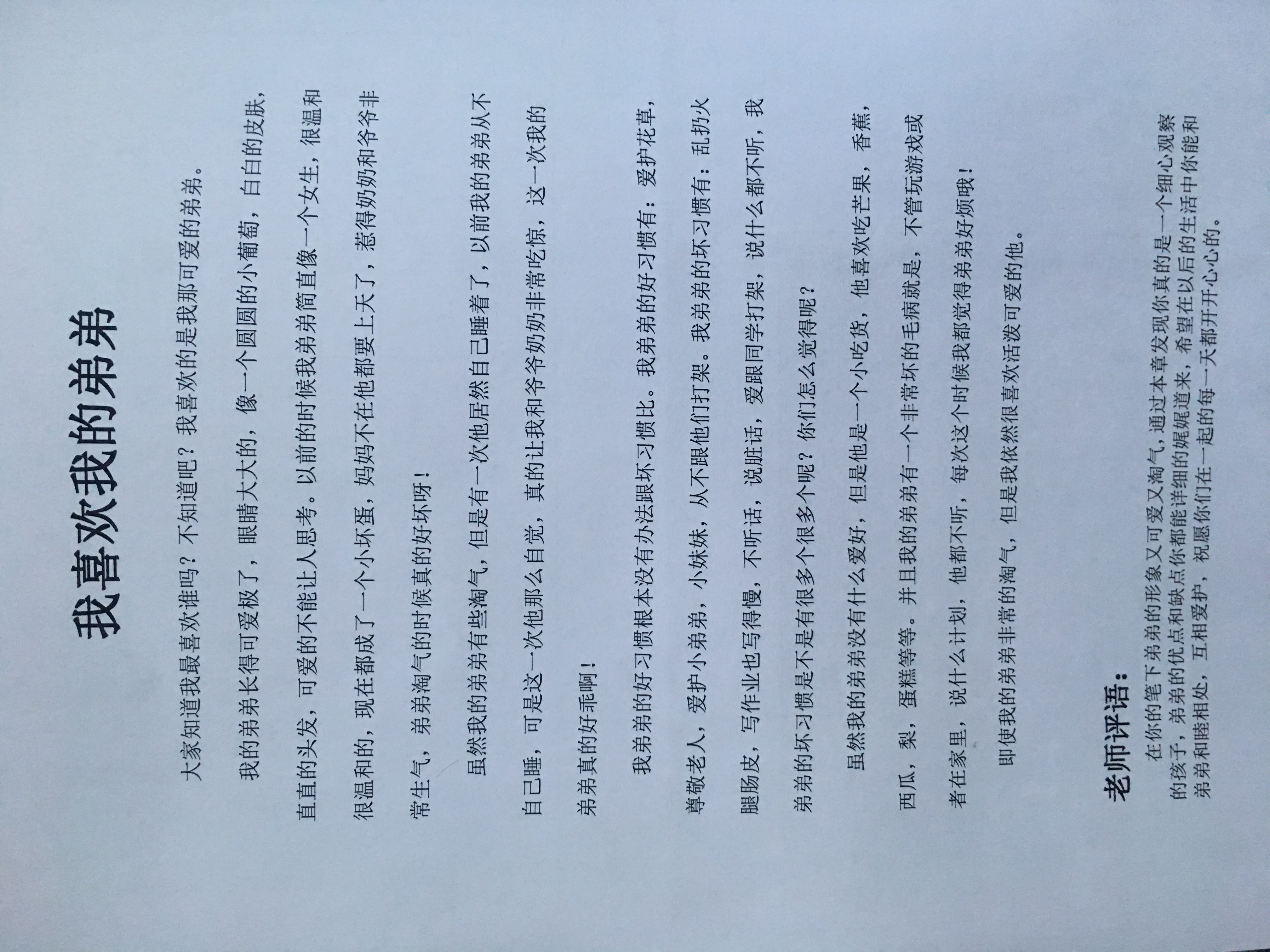 我喜欢我的弟弟 热746 类别:写人 发表时间:2018-08-28 18:51 已有 747 次阅读 指导老师:马明霞 所属学校:郑州经济技术开发区朝凤路小学