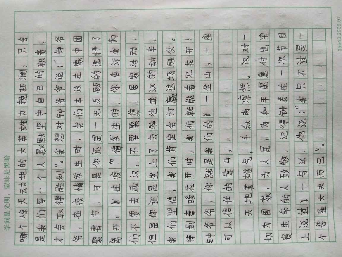 版权说明: A类权限 我谨保证我是此作品的著作权人,并且此作品系首发于郑州教育信息网作文博览频道。我同意郑州教育信息网作文博览频道作为此作品版权的独占代理人。在撤销本委托之前,我不再将此作品投给其他媒体,有关此作品发表和转载等任何事宜,由郑州教育信息网作文博览频道全权负责。未经郑州教育信息网作文博览频道转授权,其他媒体一律不得转载。 |
