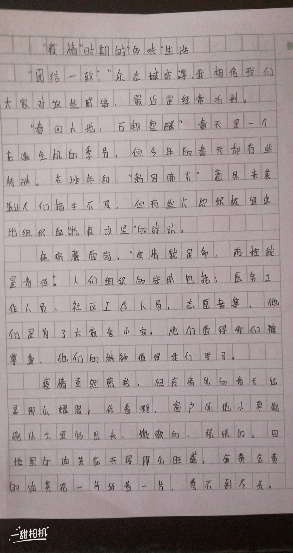 “疫情”时期的“多味”生活 热625 类别:其他 发表时间:2020-05-31 07:46 已有 626 次阅读 指导老师:王宇丹老师 所属学校:登封市大金店镇第一初级中学
