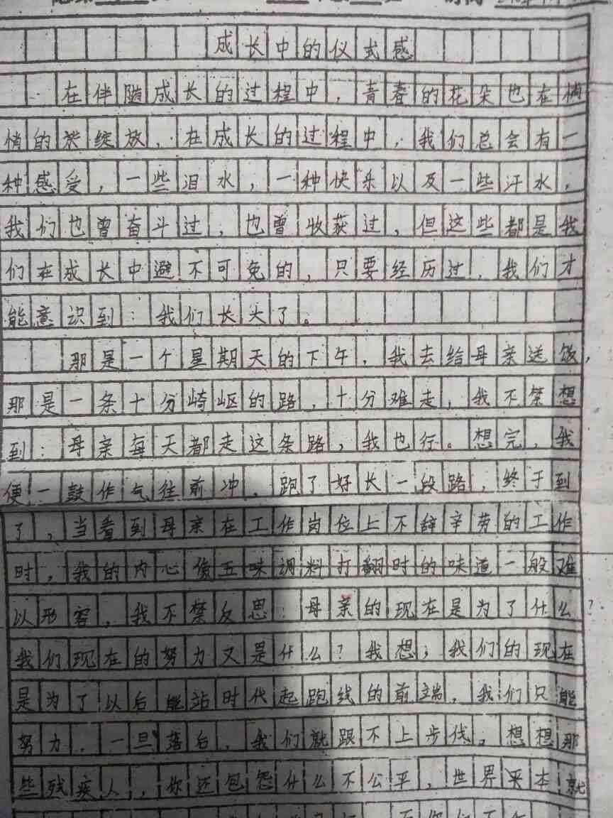 成长的仪式感 热1065 类别:叙事 发表时间:2018-10-06 09:20 已有 1066 次阅读 指导老师:贾俊乾 所属学校:登封市大金店梅村初中