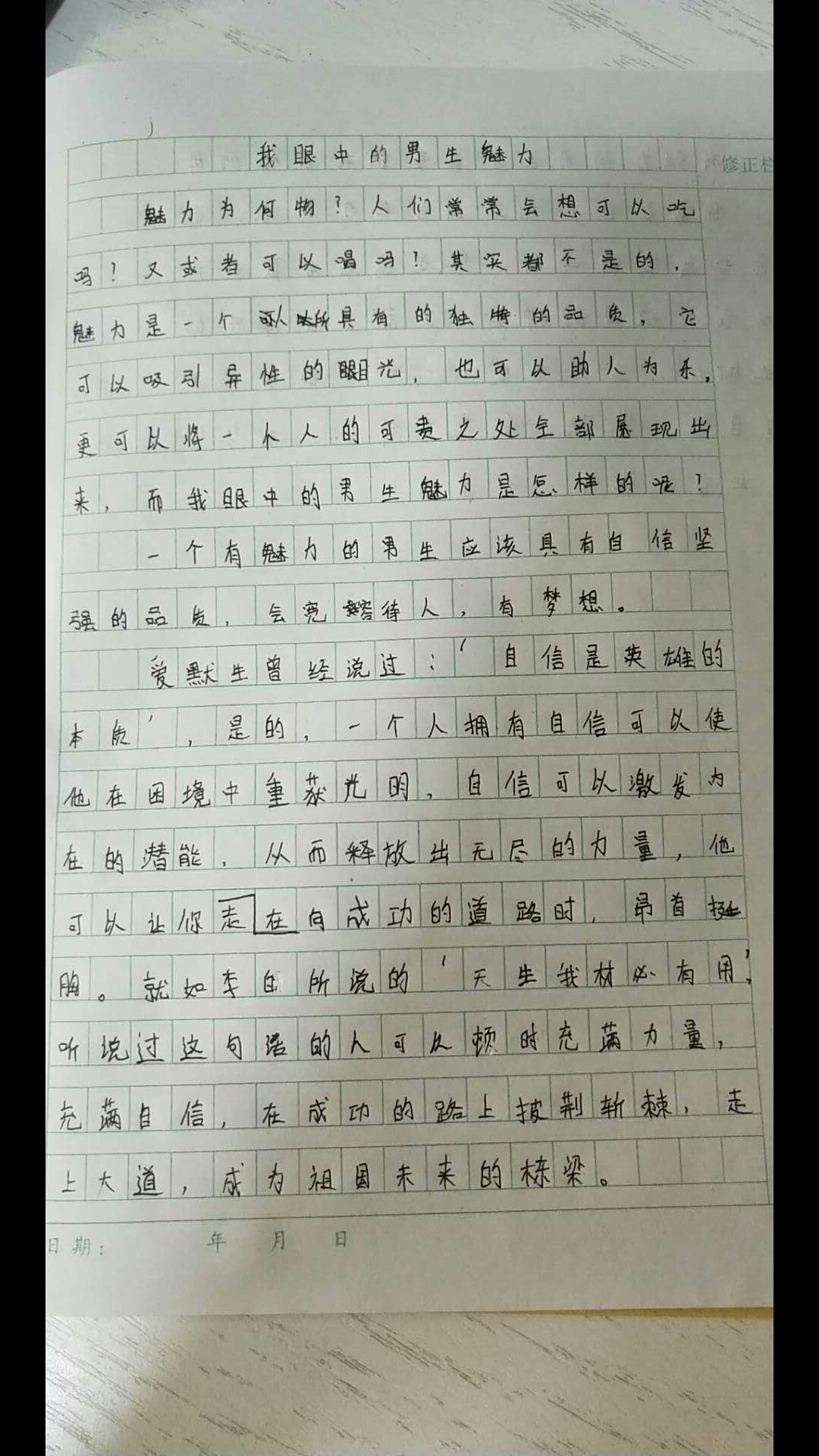 我眼中的男生魅力 热192 类别:写人 发表时间:2018-09-23 09:22 已有 193 次阅读 指导老师:张建军 所属学校:登封新区中强学校