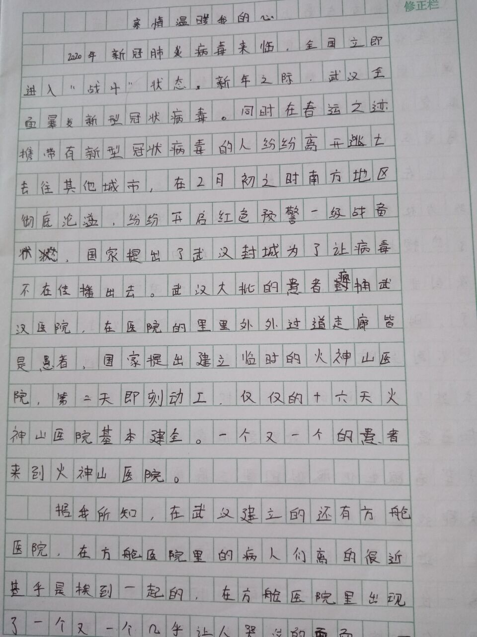 亲情温暖我的心 热419 类别:记叙 发表时间:2020-06-21 08:46 已有 420 次阅读 指导老师:刘东生 所属学校:登封新区中强学校