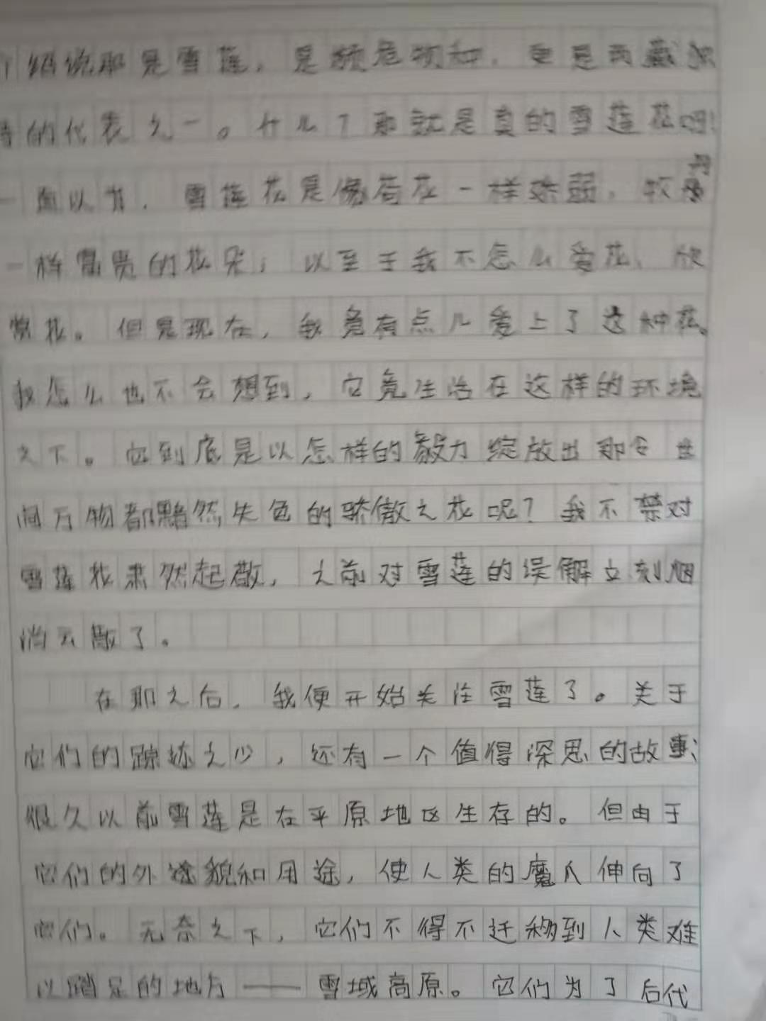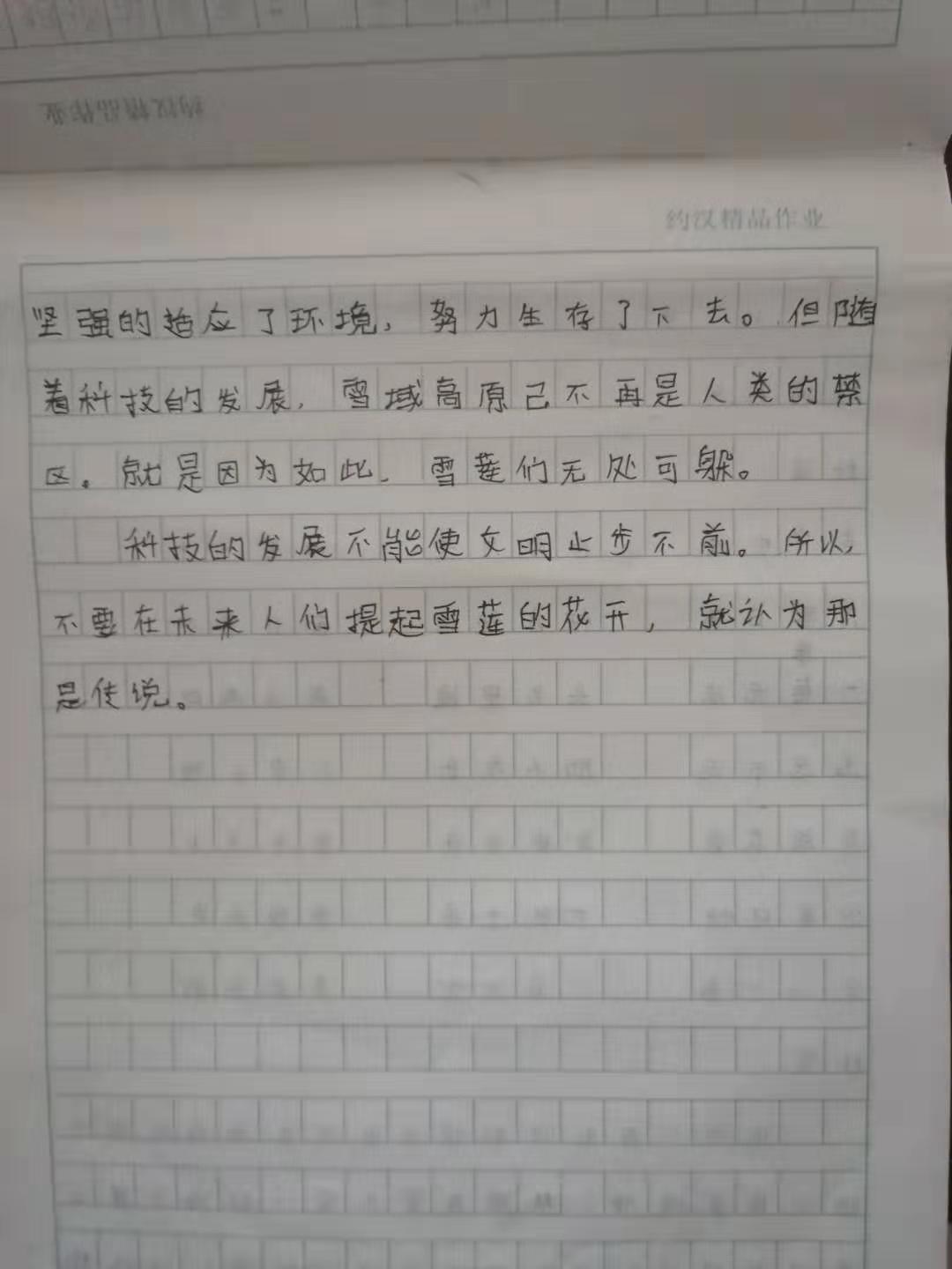 (6) 科技的发展不能使文明止步不前。所以,我呼吁广大人类同胞们,给雪莲留一条生路,不要在未来人们提起雪莲的花开,都认为那只是个传说。 眉批:结构层次条理不够清晰。