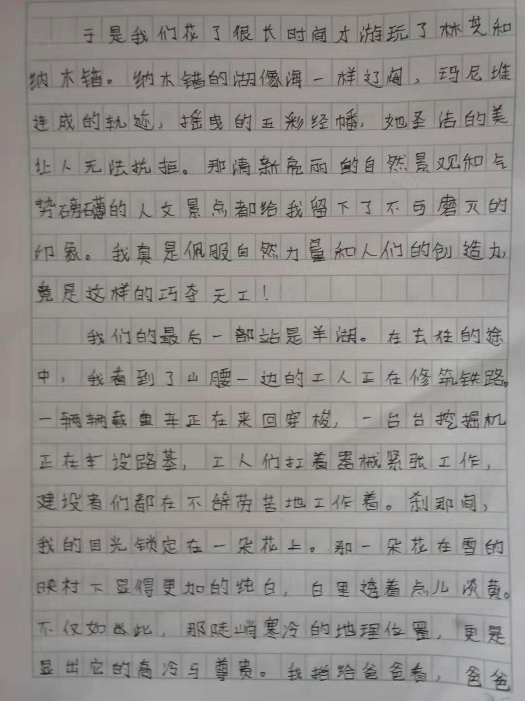 (4) 我们的最后一站是羊湖。在去往的途中,我看到了山腰一边的工人正在修筑铁路。一辆辆载重车正在来回穿梭,一台台挖掘机正在铺设路基,工人们扛着器械紧张工作,建设者们都在不辞劳苦地工作着。刹那间,我的目光锁定在一朵花上。那朵花在雪的映衬下显得更加的纯白,白里透着点儿淡黄。不仅如此,那陡峭寒冷的地理位置,更是显出它的高冷与尊重。我指给爸爸看,爸爸介绍说那是雪莲,是濒危物种,更是西藏独特的代表之一。什么?那就是真的雪莲花吗?一直以为,雪莲花是像荷花一样娇弱,牡丹一样富贵的花朵;以至于我不怎么爱花,欣赏花。但是现在,我竟有点儿爱上了这种花了。我怎么也不会想到,它竟生活在这样的环境之下。它到底是以怎样的毅力绽放出那令世间万物黯然失色的骄傲之花呢?我不禁对雪莲花肃然起敬,之前对雪莲的误解也烟消云散了。 眉批:人物出场环境描述比较具体。