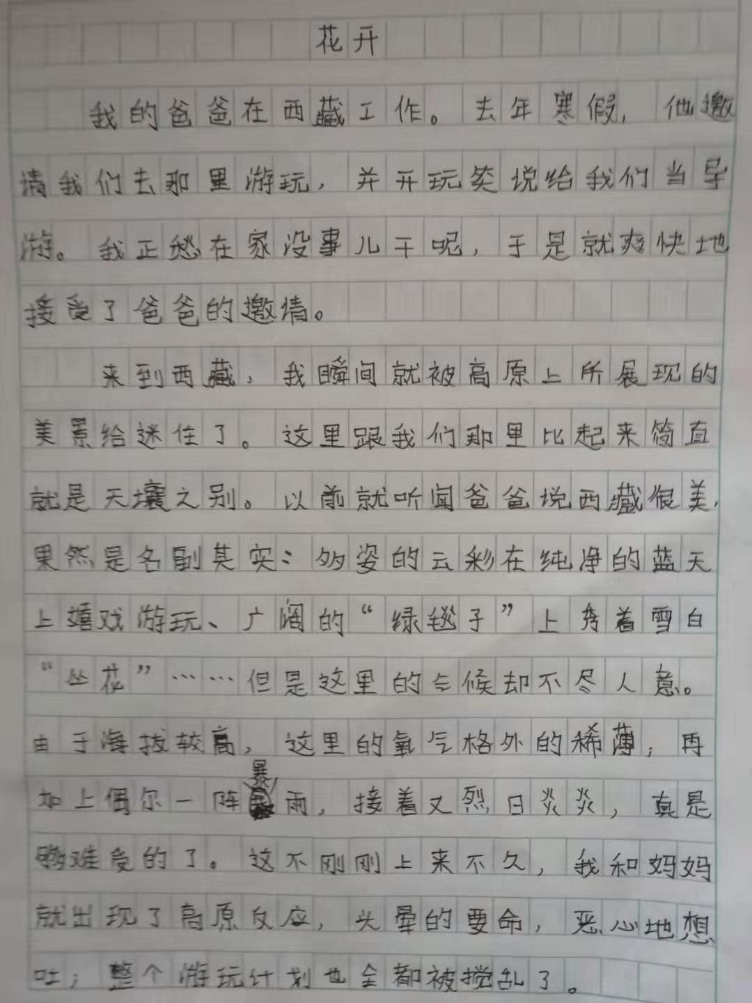 (2) 来到西藏,我瞬间就被高原上所展现的美景给迷住了。以前就听爸爸说西藏很美,果然是名副其实:多姿的云彩在纯净的蓝天上嬉戏游玩、广阔的“绿毯子”上绣着雪白的“花朵”…但是这里的气候却不尽人意。由于海拔较高,这里的氧气格外的稀薄;再加上偶尔一阵暴雨,接着又烈日炎炎,真是够难受的了。这不刚刚上来不久,我和妈妈就出现了高原反应,头晕得要命,恶心地想吐,整个游玩计划也全部都被搅乱了。