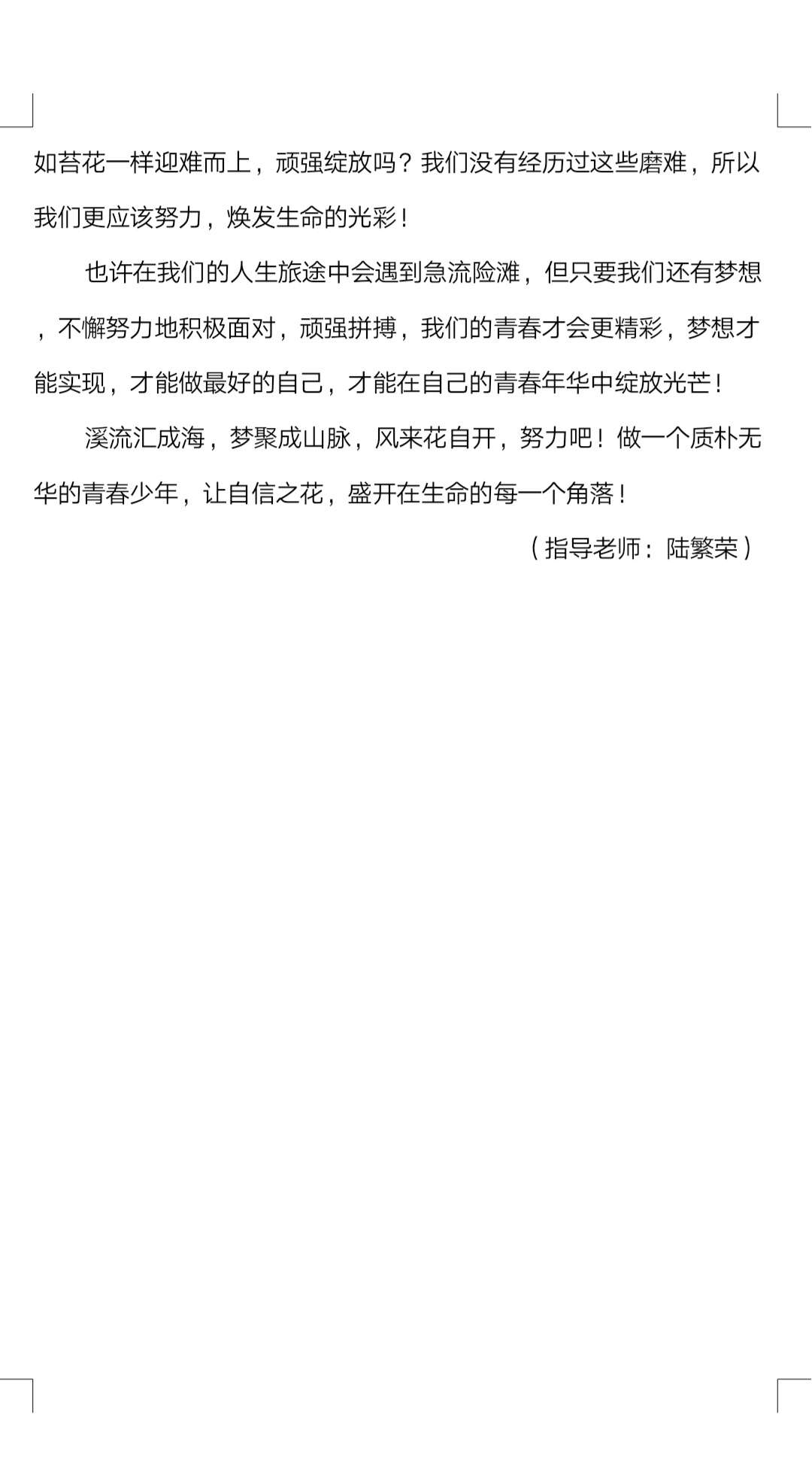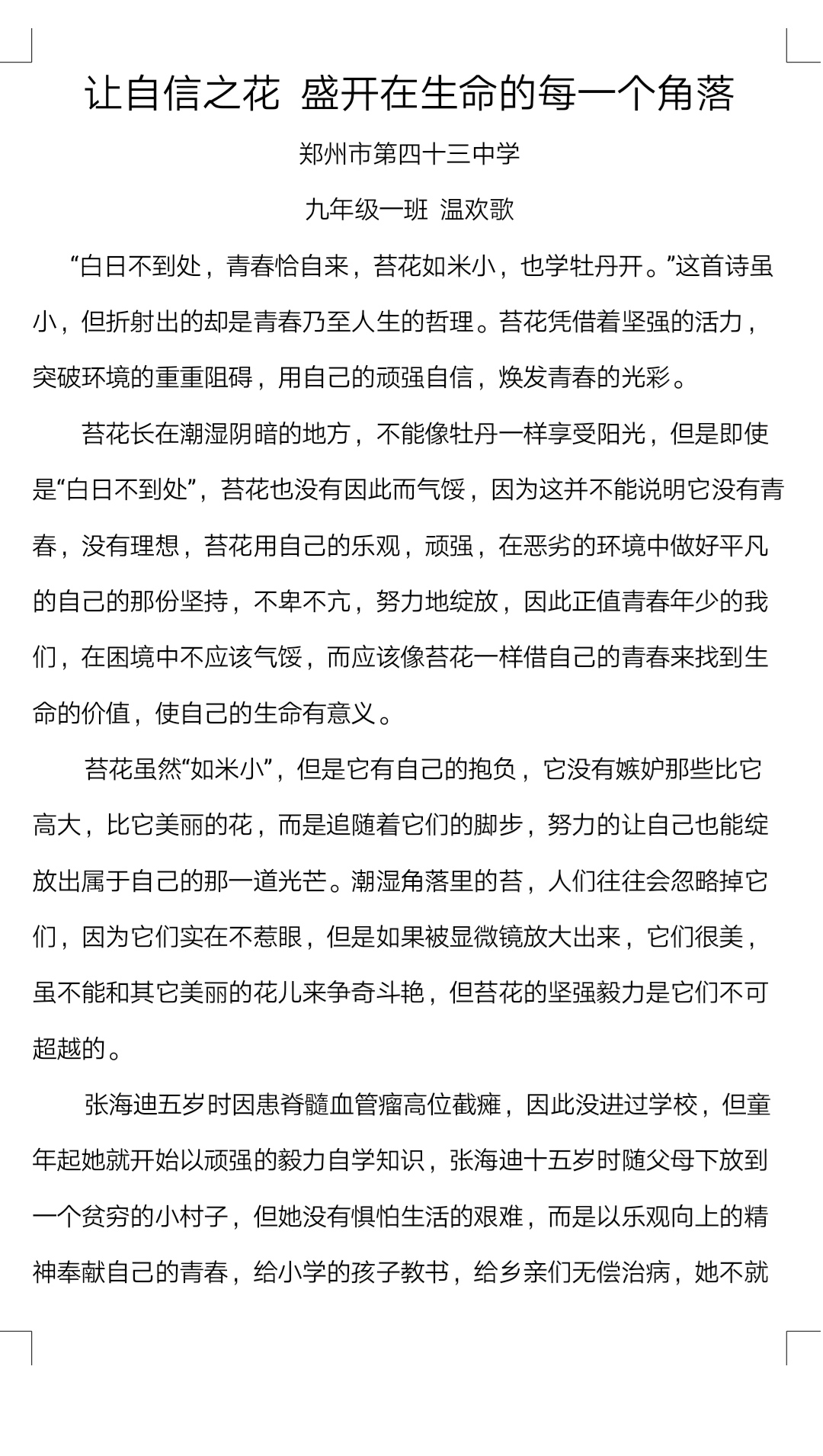 让自信之花 盛开在生命的每一个角落 热256 类别:原创 发表时间:2018-09-29 13:04 已有 257 次阅读 指导老师:陆繁荣 所属学校:郑州市第四十三中学