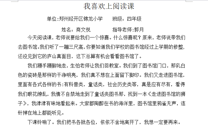 我喜欢上阅读课 热539 类别:叙事 发表时间:2018-10-03 17:13 已有 539 次阅读 指导老师:郭月 所属学校:锦龙小学
