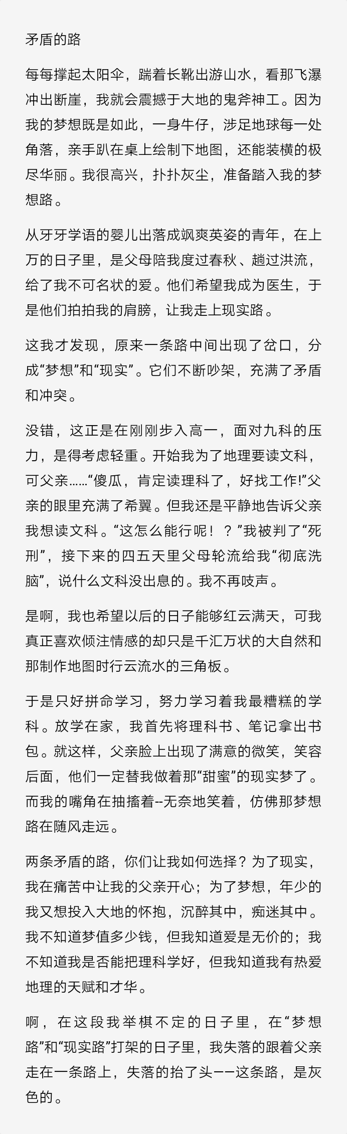 矛盾的路 热826 类别:记叙 发表时间:2018-10-06 18:32 已有 826 次阅读 指导老师:李素芳 所属学校:郑州市第九中学