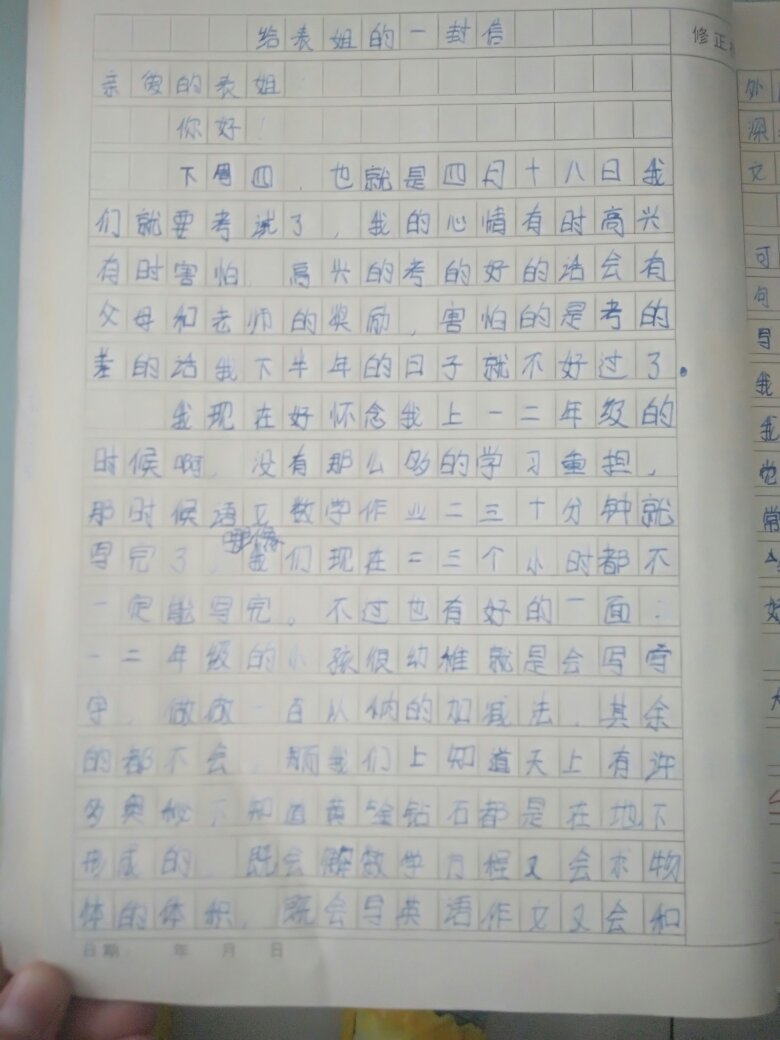 给表姐的一封信 热563 类别:其他 发表时间:2019-08-04 12:51 已有 564 次阅读 指导老师:常书霞 所属学校:登封市少林路小学