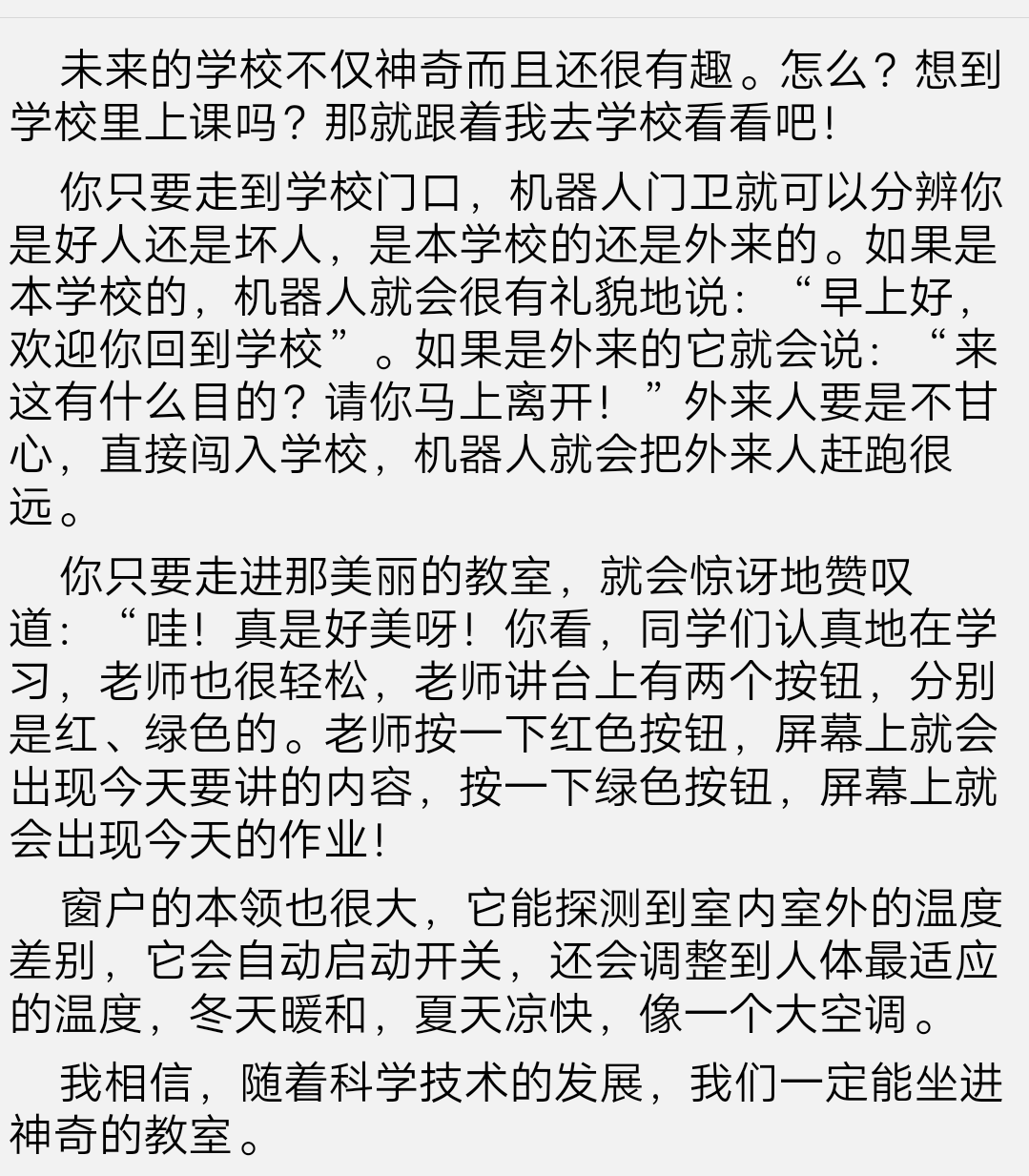 末来的教室 热503 类别:状物 发表时间:2018-10-07 15:00 已有 504 次阅读 指导老师:赵老师 所属学校:荥阳市第九小学