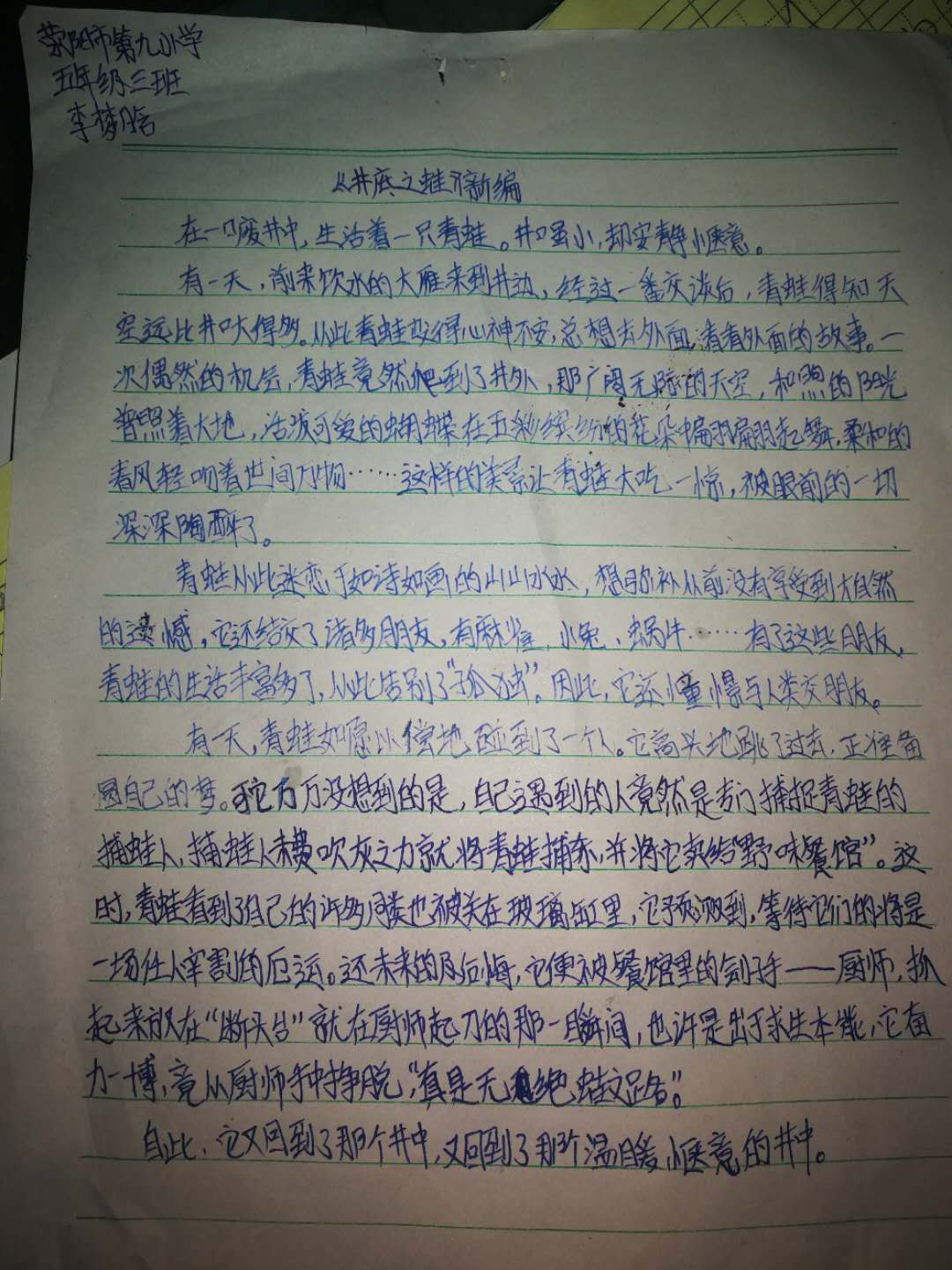 《井底之蛙》新编 热577 类别:叙事 发表时间:2018-10-08 21:40 已有 578 次阅读 指导老师:王爱青 所属学校:荥阳市第九小学