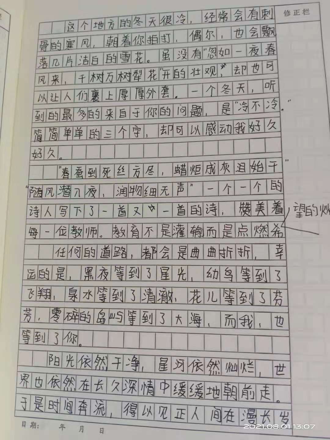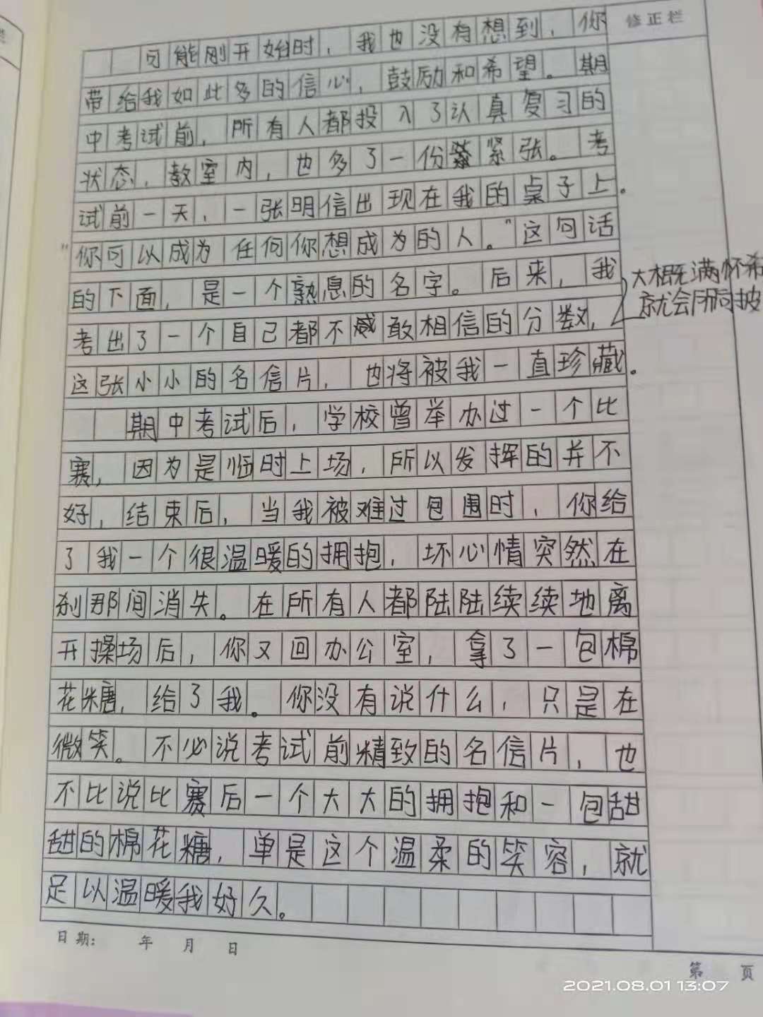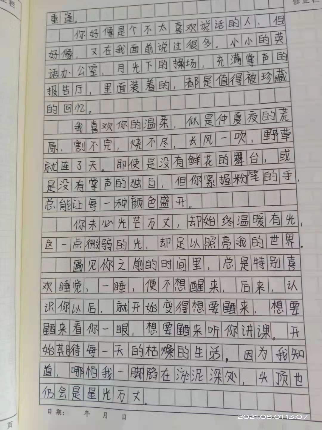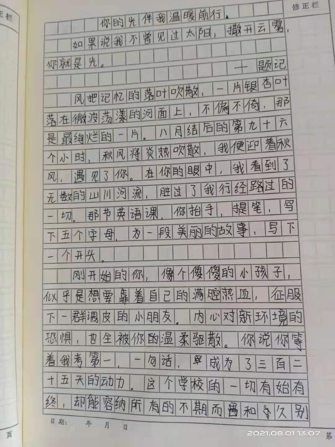 你的光伴我温暖前行 热557 类别:写人 发表时间:2021-08-01 13:22 已有 558 次阅读 指导老师:杨金梦 所属学校:郑州四中实验学校