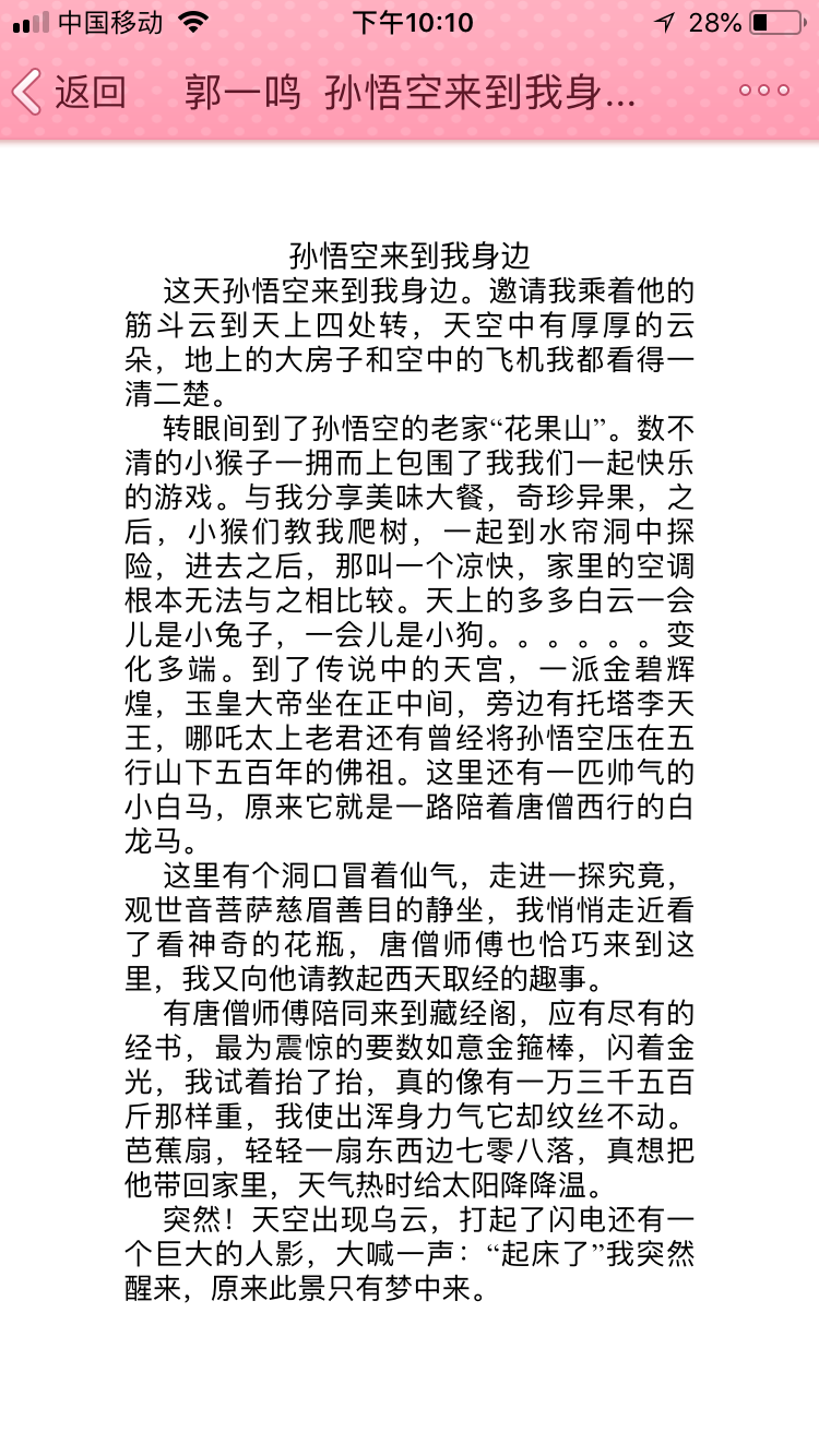 孙悟空来到我身边 热846 类别:叙事 发表时间:2018-10-09 22:16 已有 847 次阅读 指导老师:高雅丽 所属学校:郑州经济技术开发区实验小学