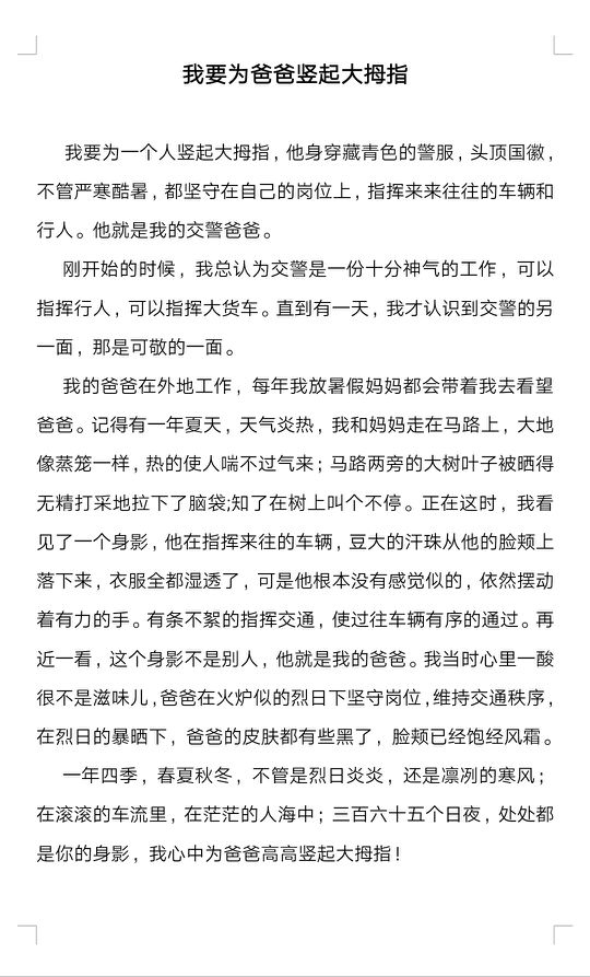 我要为爸爸竖起大拇指 热426 类别:写人 发表时间:2019-07-16 11:12 已有 427 次阅读 指导老师:袁凤云 所属学校:郑州市惠济区开元路小学