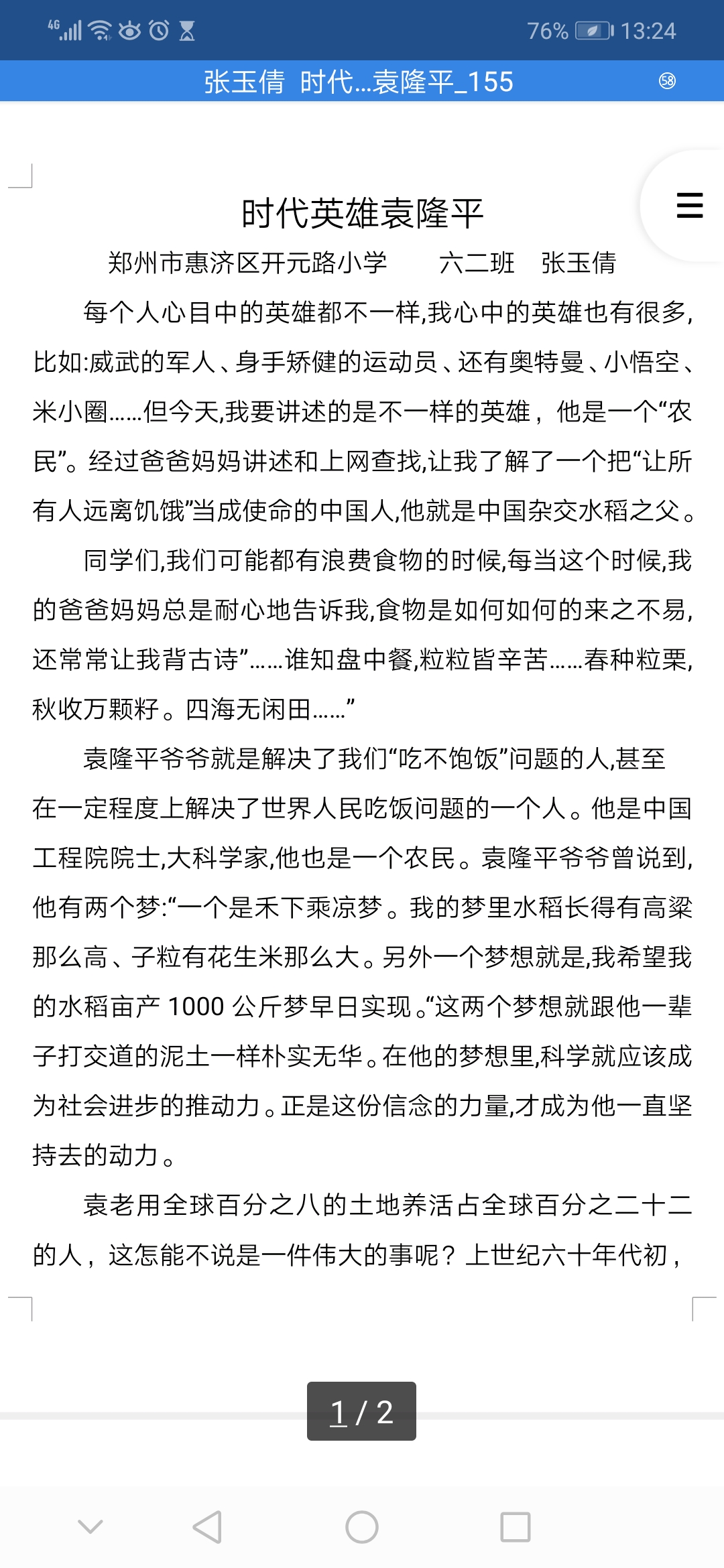 时代英雄袁隆平 热540 类别:写人 发表时间:2021-07-11 13:27 已有 541 次阅读 指导老师:王慧娜 所属学校:郑州市惠济区开元路小学