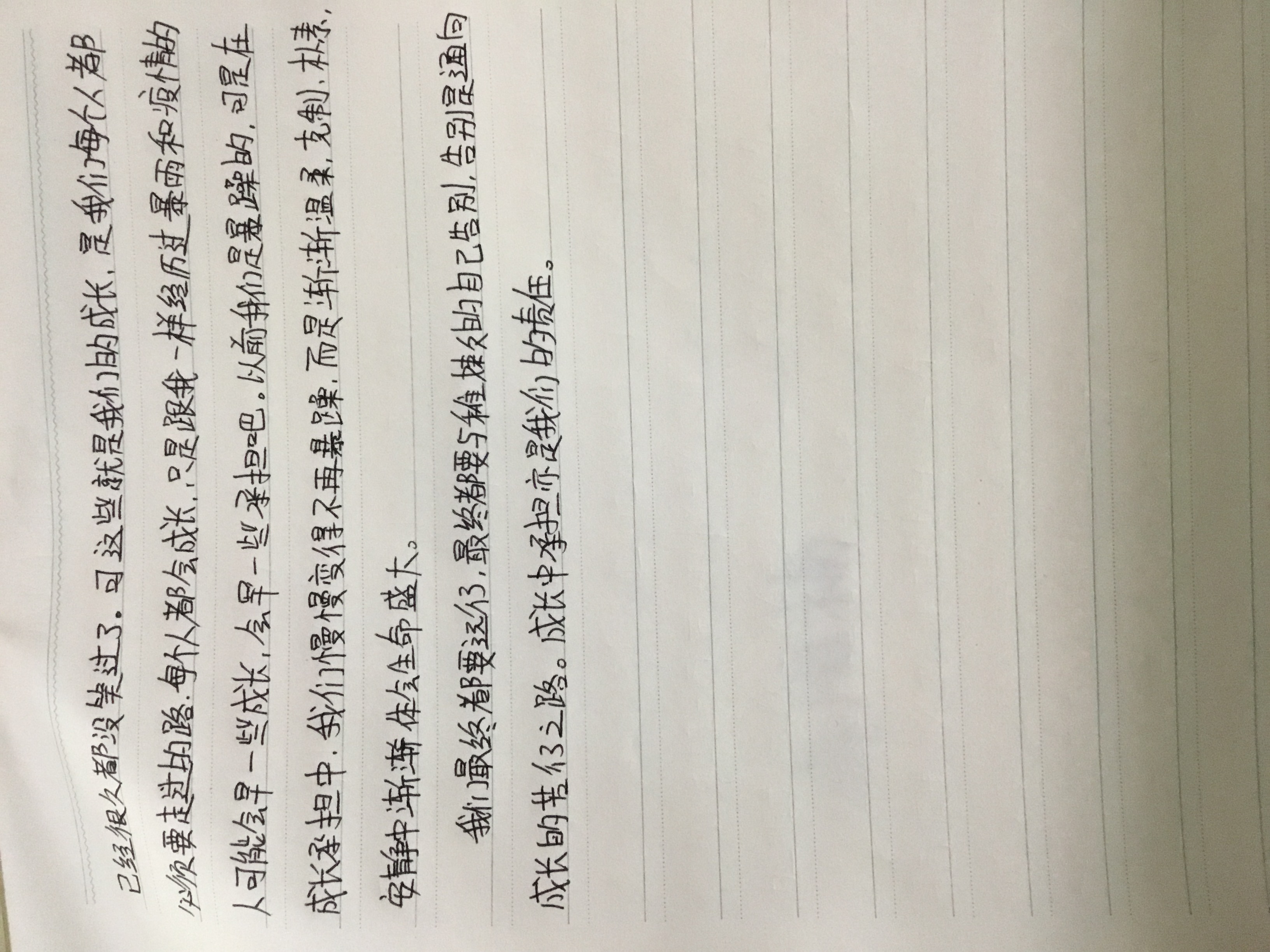 成长中的承担 热99 类别:叙事 发表时间:2021-09-14 09:37 已有 100 次阅读 指导老师:冉胜楠 所属学校:中牟县紫薇路中学