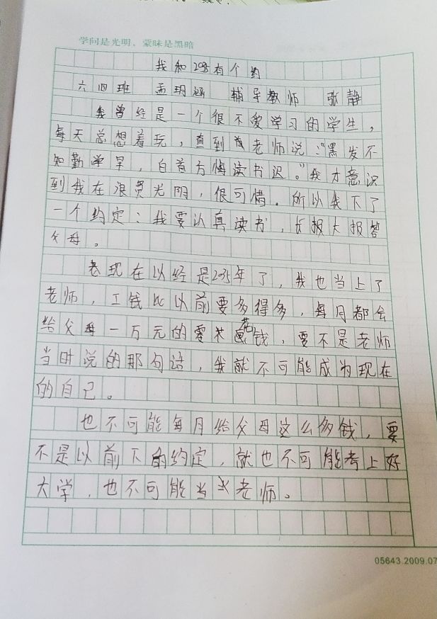 版权说明: A类权限 我谨保证我是此作品的著作权人,并且此作品系首发于郑州教育信息网作文博览频道。我同意郑州教育信息网作文博览频道作为此作品版权的独占代理人。在撤销本委托之前,我不再将此作品投给其他媒体,有关此作品发表和转载等任何事宜,由郑州教育信息网作文博览频道全权负责。未经郑州教育信息网作文博览频道转授权,其他媒体一律不得转载。 |
