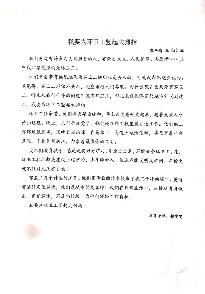 我要为环卫工竖起大拇指 热508 类别:记叙 发表时间:2019-06-02 20:25 已有 509 次阅读 指导老师:郭雯雯 所属学校:华中师范大学附属高新区荣邦城小学