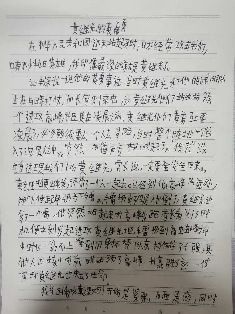 黄继光的英勇 热648 类别:叙事 发表时间:2021-09-09 20:46 已有 649 次阅读 指导老师:李慧 所属学校:中牟县平安路学校