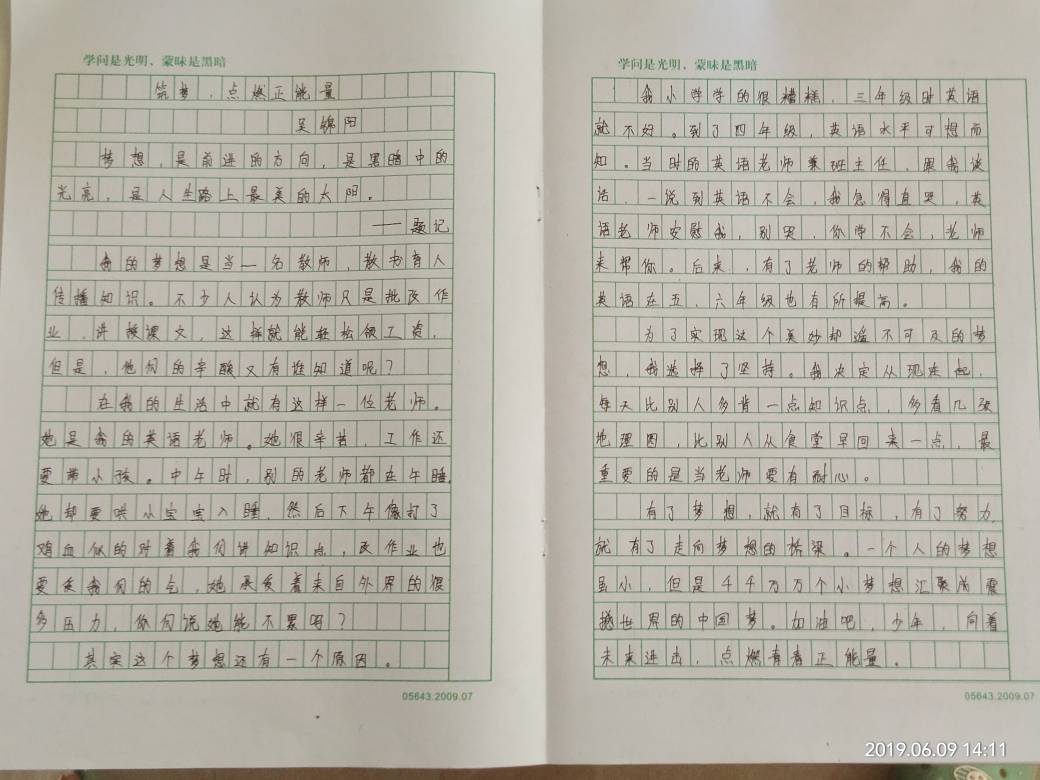 筑梦,点燃正能量 热876 类别:记叙 发表时间:2019-06-09 14:26 已有 877 次阅读 指导老师:朱志刚 所属学校:中牟县平安路学校