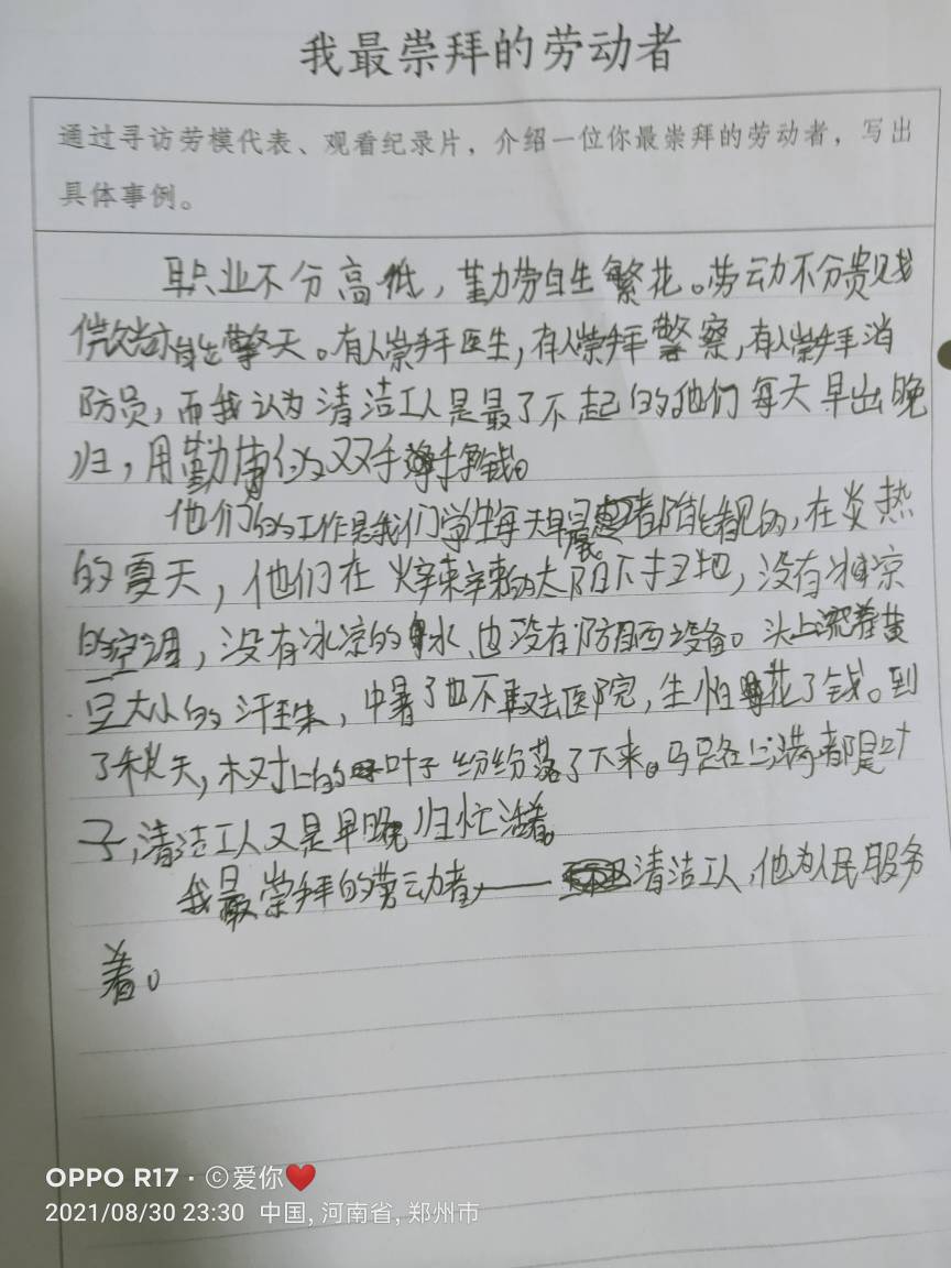 我最崇拜的劳动者 热543 类别:写人 发表时间:2021-08-30 23:32 已有 544 次阅读 指导老师:任蓓 所属学校:郑州市金水区南阳路第三小学