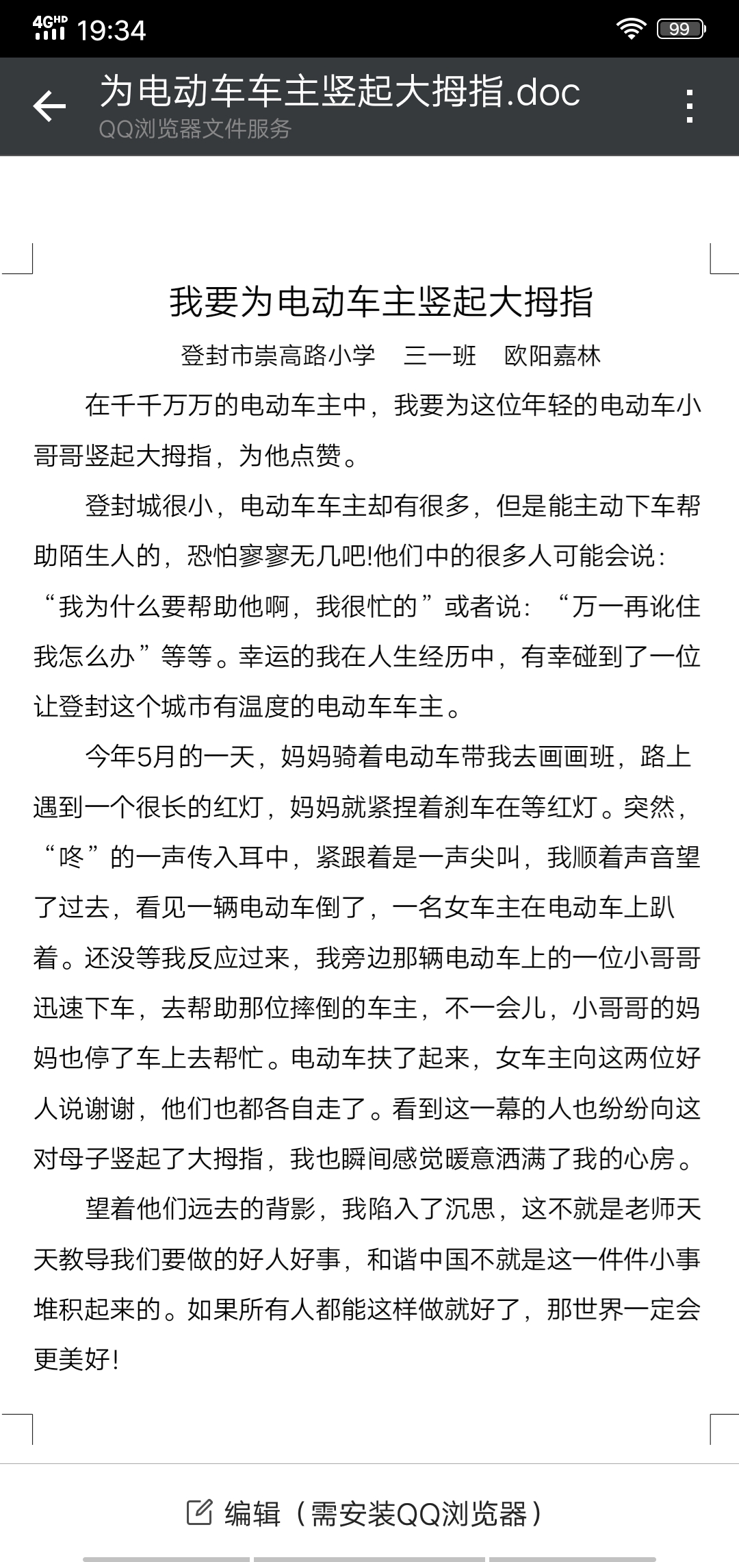 我要为电动车主竖起大拇指 热340 类别:叙事 发表时间:2019-06-15 19:40 已有 341 次阅读 指导老师:李琳琳 所属学校:登封市崇高路小学