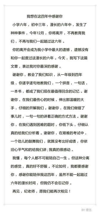我想在这四年中感谢你 热503 类别:写人 发表时间:2020-06-01 16:22 已有 504 次阅读 指导老师:纪冰洁 所属学校:郑州市金水区农科路小学