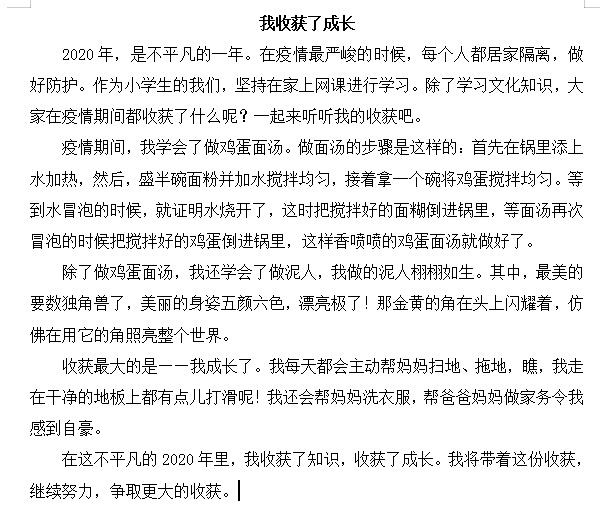 文章语言流畅,通俗易懂,具体形象地描写出了疫情期间自己的收获。会做简单的饭菜,会做泥人,会帮爸爸妈妈做力所能及的事情,一件件具体生动的事例证明了你成长了,还有什么比收获成长更令人喜悦的呢?是一篇很不错的文章。