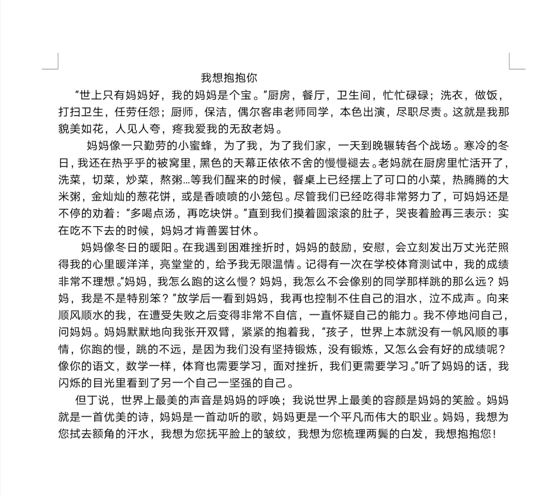 我想抱抱你 热2136 类别:写人 发表时间:2020-10-05 22:27 已有 2133 次阅读 指导老师:牛爱惠 所属学校:新密市市直第三小学