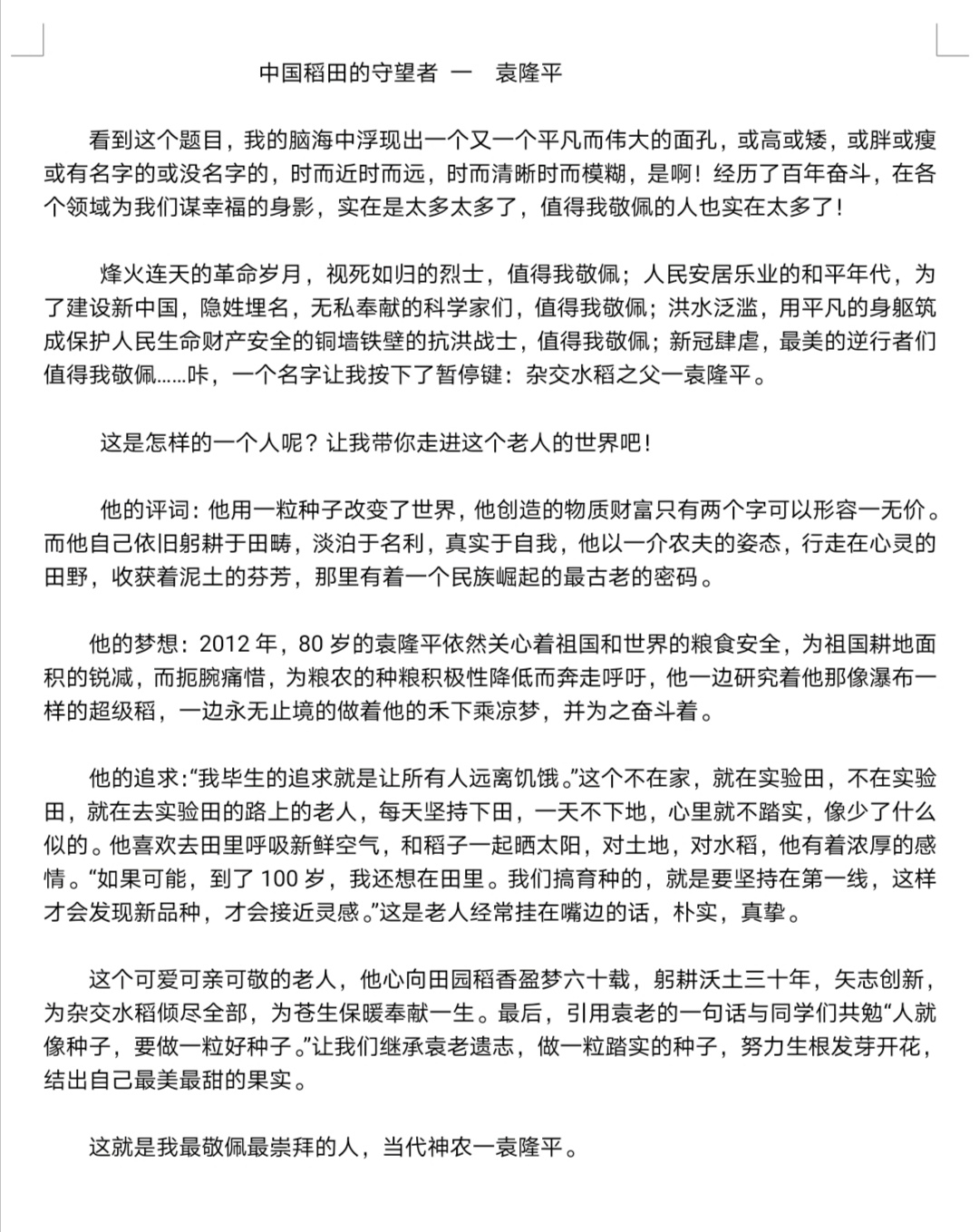 百年历程 我最崇拜的人一袁隆平 热3892 类别:写人 发表时间:2021-08-18 10:44 已有 3888 次阅读 指导老师:牛爱惠 所属学校:新密市市直第三小学