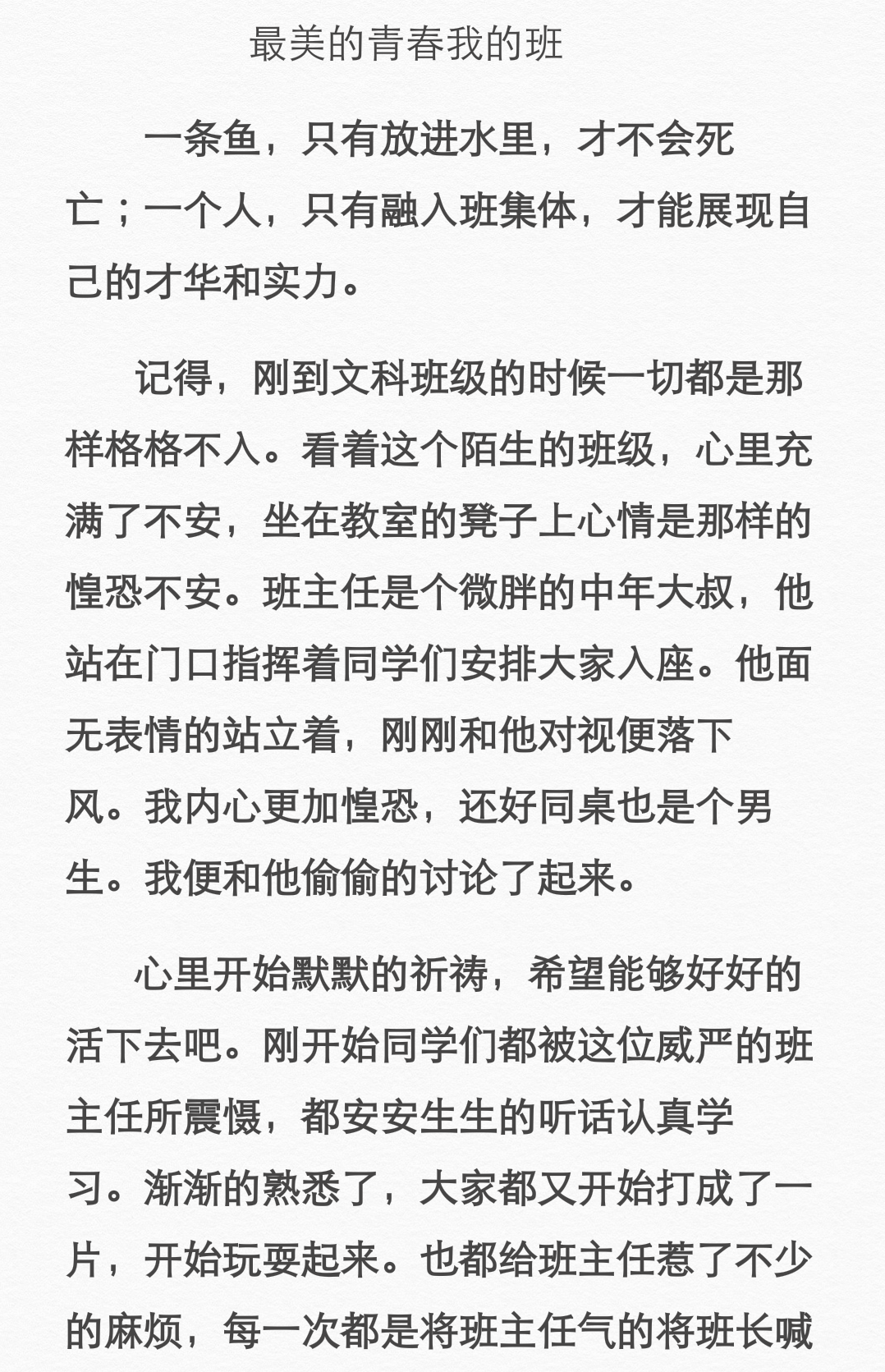 最美的青春我的班 热509 类别:叙事 发表时间:2019-07-28 16:20 已有 510 次阅读 指导老师:王京京 所属学校:登封市第一高级中学
