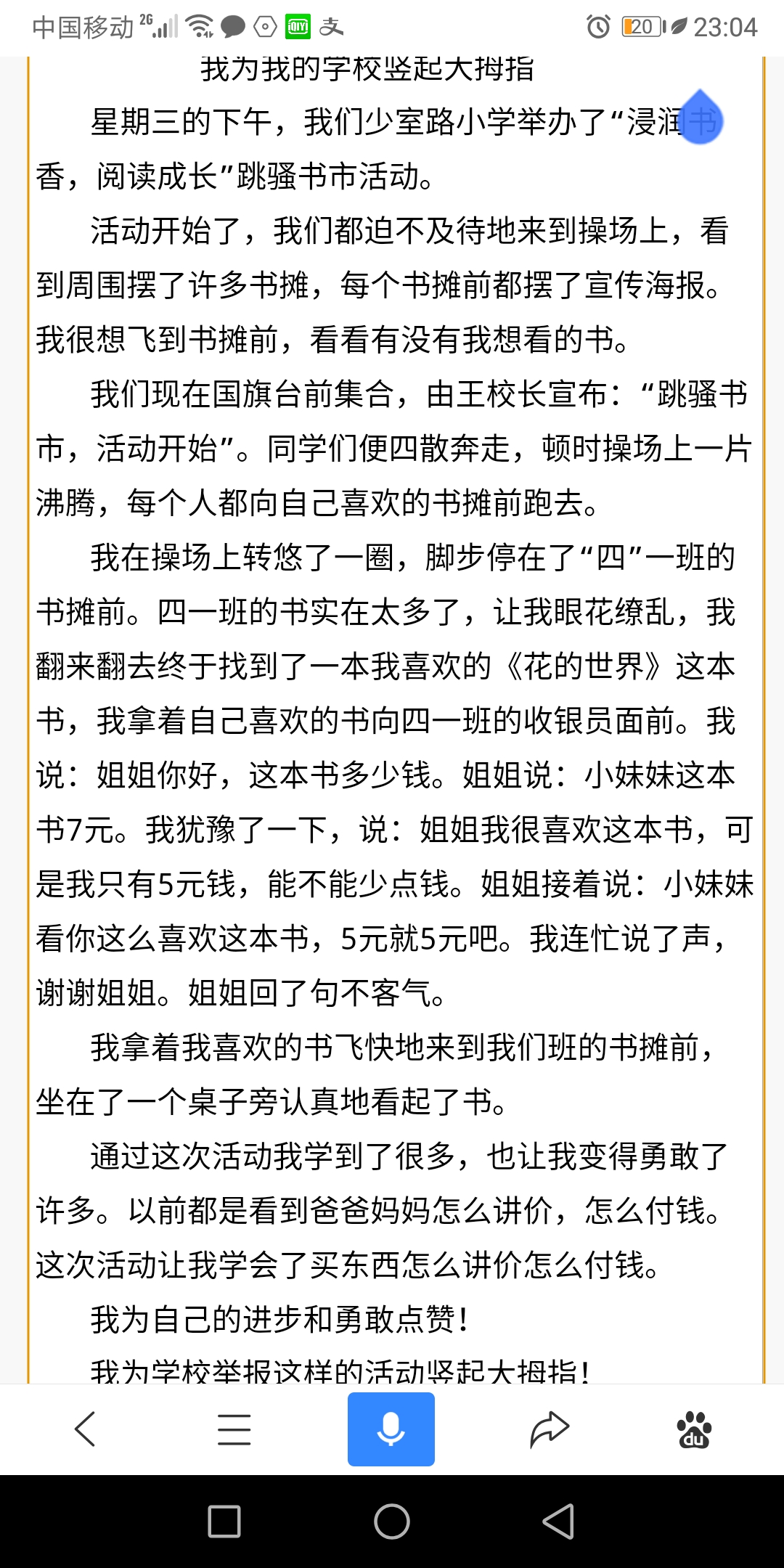 我为我的学校竖起大拇指 热842 类别:记叙 发表时间:2019-08-10 23:18 已有 843 次阅读 指导老师:刘盈丽 所属学校:登封市少室路小学