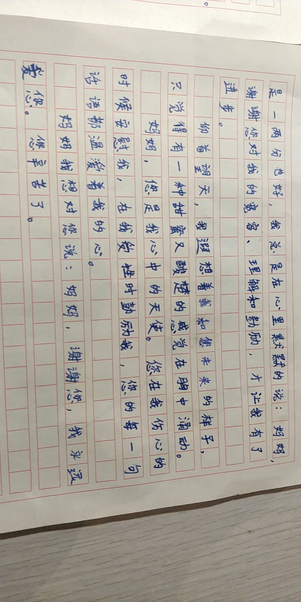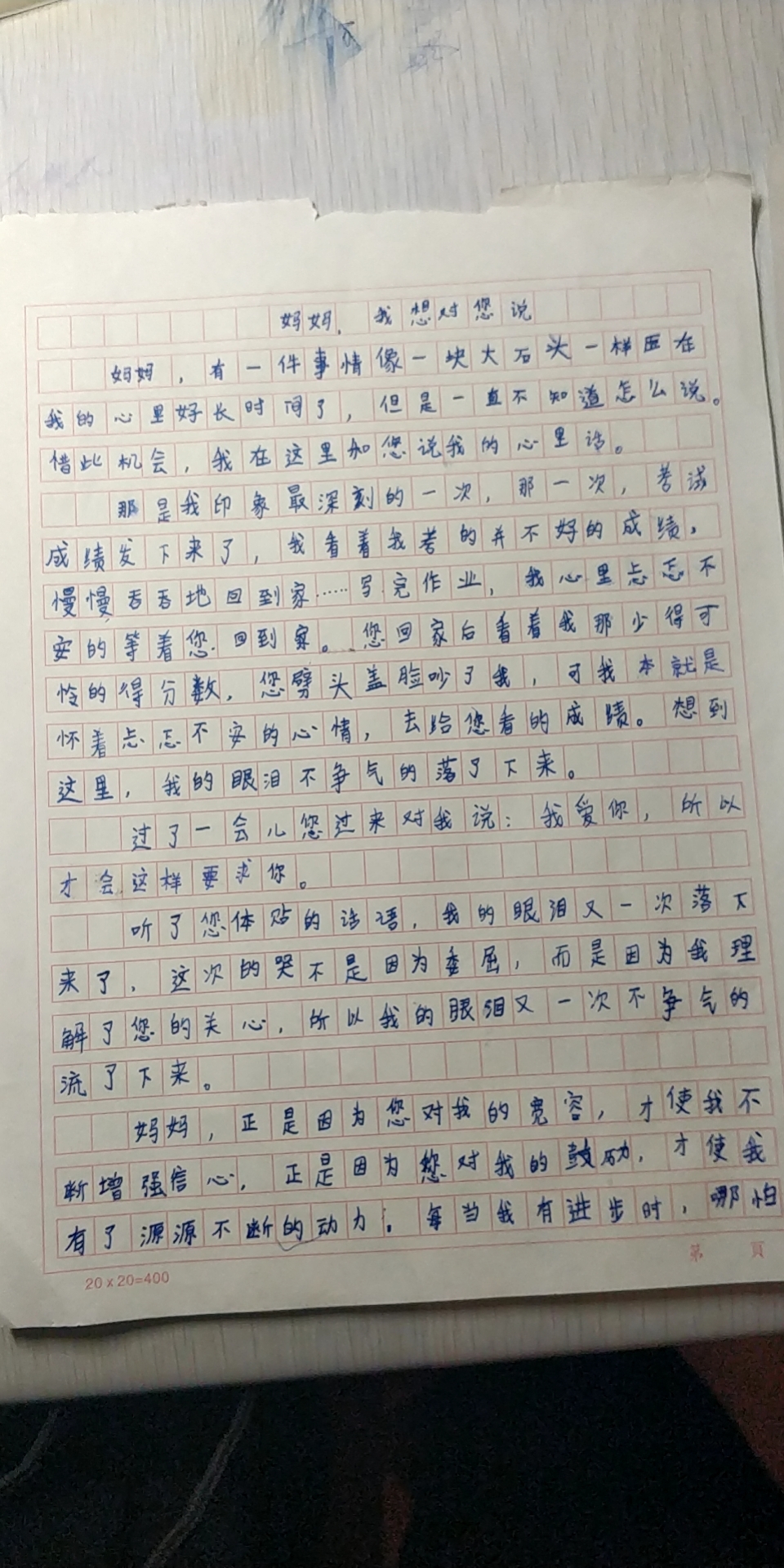 妈妈,我想对您说 热1269 类别:叙事 发表时间:2020-12-22 21:35 已有 1270 次阅读 指导老师:贾书凤 所属学校:郑州市二七区幸福路小学