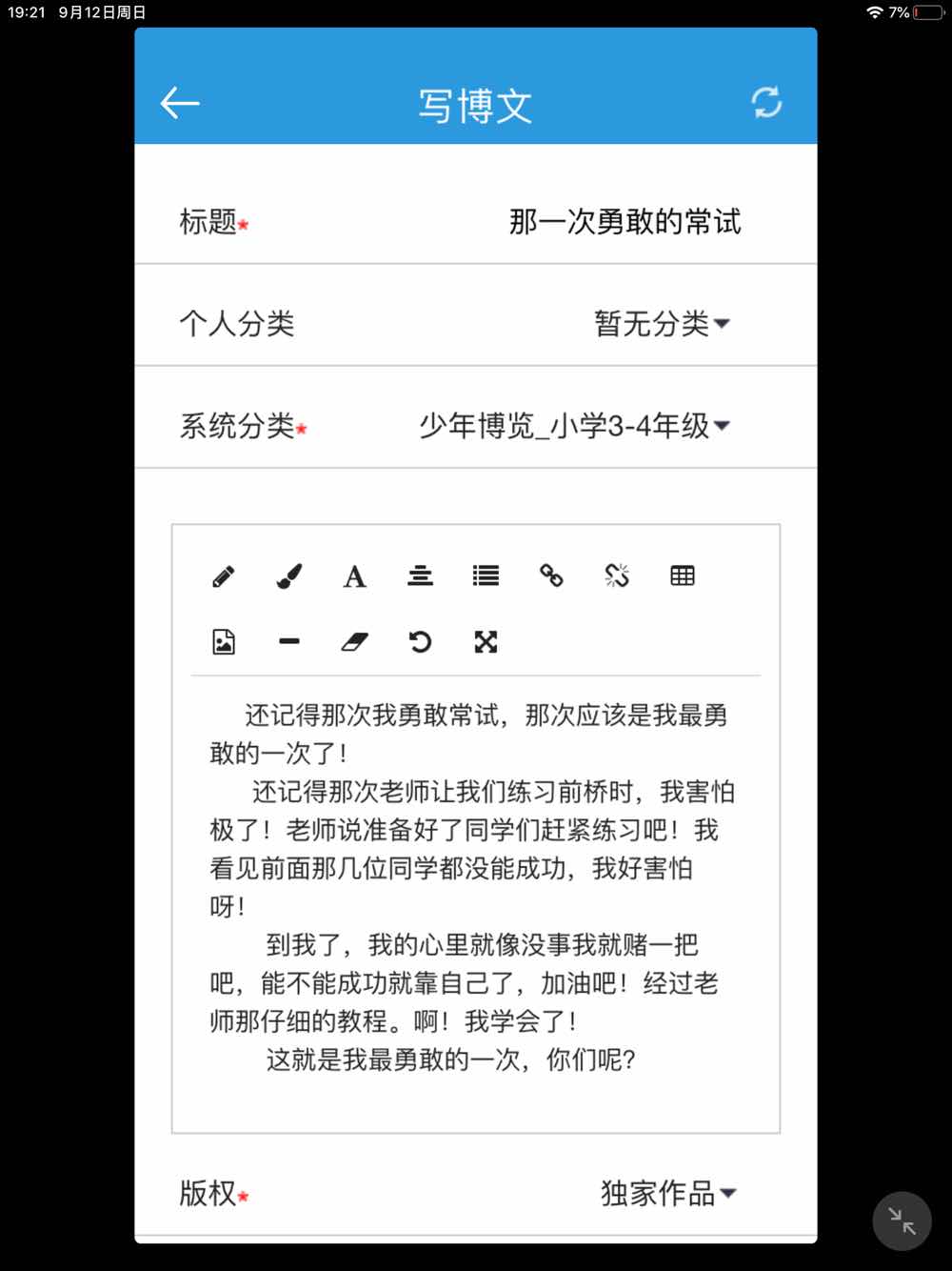 那一次勇敢的尝试 热294 类别:叙事 发表时间:2021-09-12 19:25 已有 295 次阅读 指导老师:文娟 所属学校:中牟县城东路小学