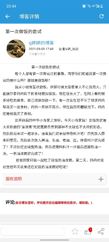 那是一次做饭的尝试 热607 类别:叙事 发表时间:2021-09-05 23:47 已有 608 次阅读 指导老师:王利娜 所属学校:中牟县城东路小学