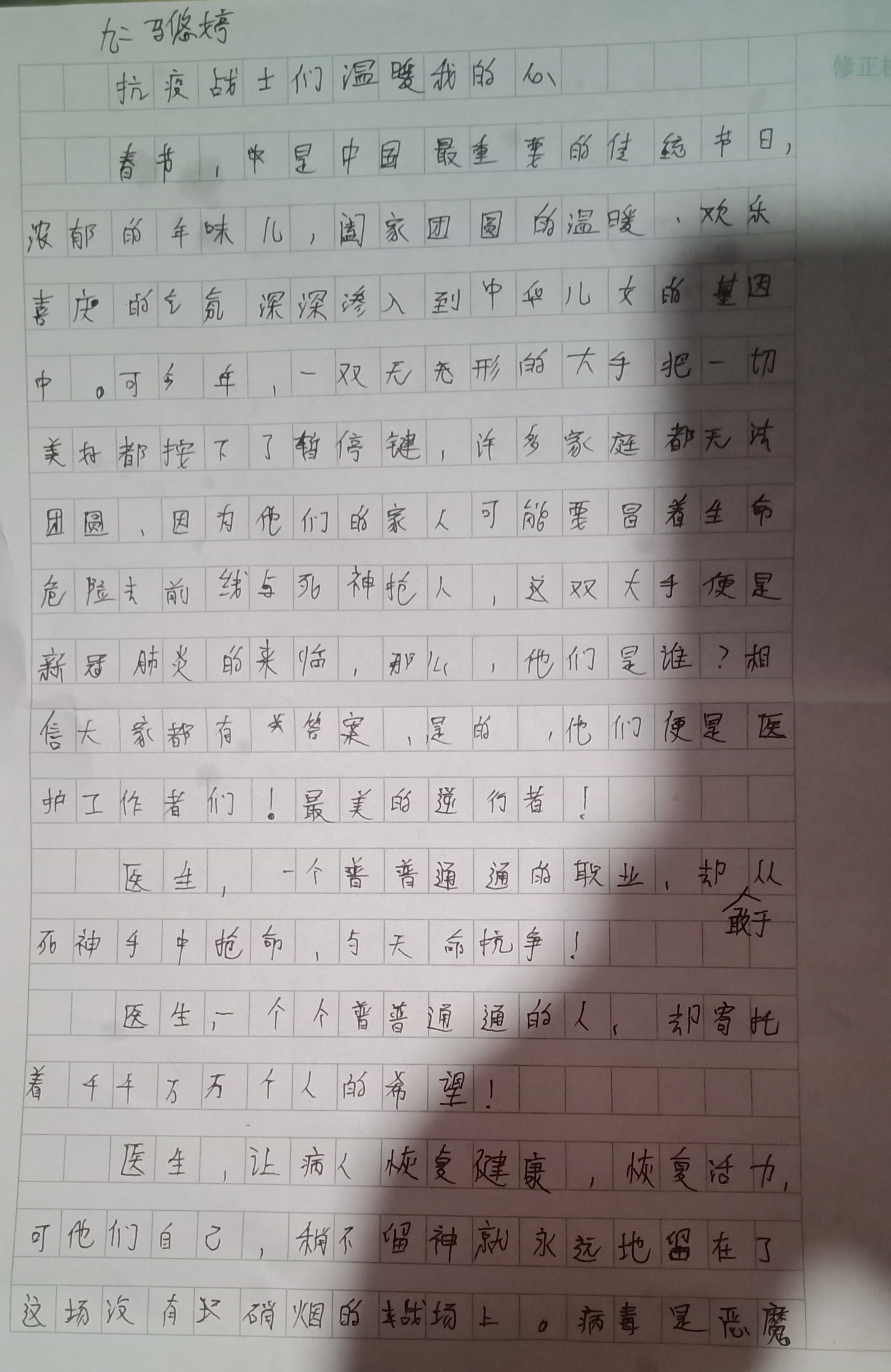抗疫战士们温暖我的心 热900 类别:写人 发表时间:2020-06-26 13:14 已有 901 次阅读 指导老师:岳艳艳 所属学校:登封市宣化镇初级中学