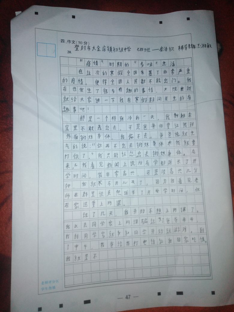 "疫情"期间的"多味"生活 热341 类别:记叙 发表时间:2020-05-30 16:31 已有 342 次阅读 指导老师:王湘敏 所属学校:登封市大金店镇第一初级中学